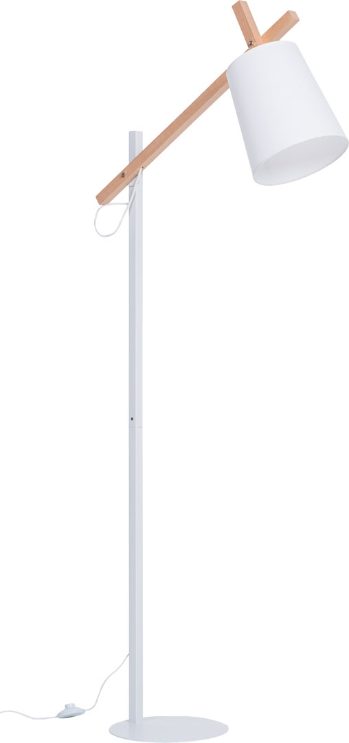 Lampa podłogowa posiada drewniane ramię o długości 70 cm i metalową podstawę wysoką na 140 cm.