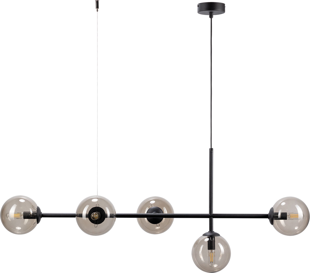Wisząca 5-punktowa oprawa z kulistymi kloszami wychodzącymi z różnych stron oprawy. Świetny wybór do oświetlenia salonu, czy stołu w jadalni. Dymione klosze oprawy w komplecie z żarówkami typu filament świetnie prezentują się w nowoczesnych wnętrzach.