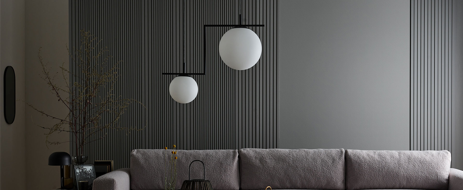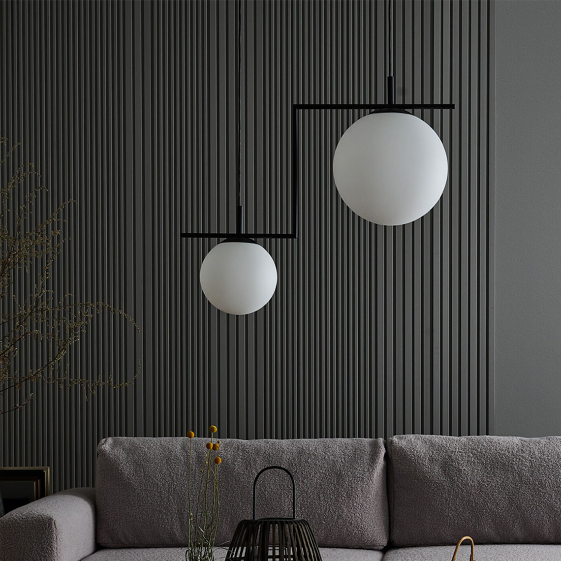 Asymetryczna wisząca oprawa z dwoma okrągłymi kloszami o średnicy 20cm i 30cm. Bardzo dobrze będzie wyglądać zwłaszcza nad stołami lub nad wyspą kuchenną. Mleczne klosze oprawy zapewniają przyjemne, równomiernie rozproszone miękkie światło.