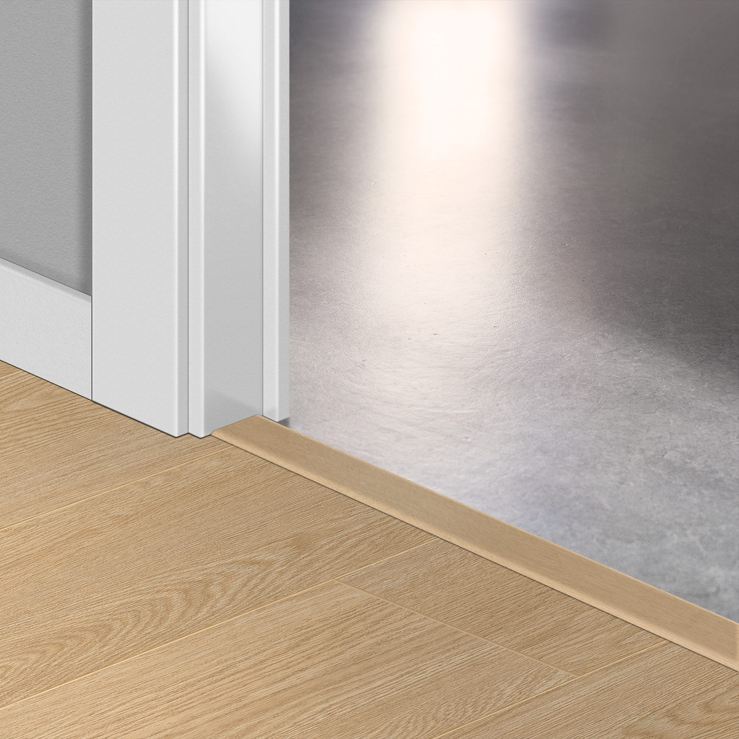 Tej samej listwy możesz użyć do wszystkich wykończeń – pomiędzy dwoma podłogami o tej samej wysokości lub o różnych wysokościach i w miejscach połączenia podłogi ze ścianą, oknem albo wykładziną dywanową.