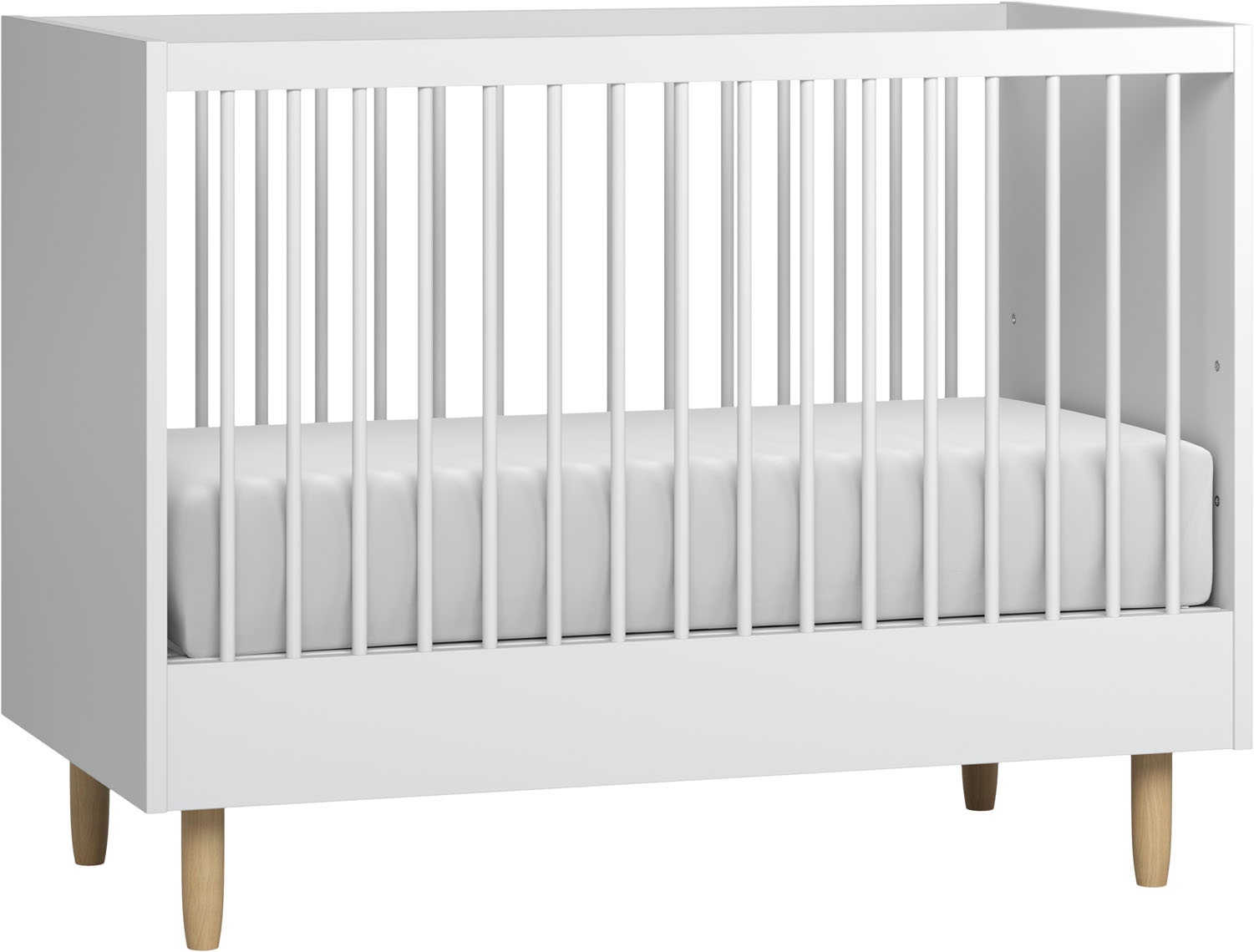 - Stelaż łóżka możesz montować na 3 różnych wysokościach, by dostosować wysokość położenia materaca do wieku niemowlaka.