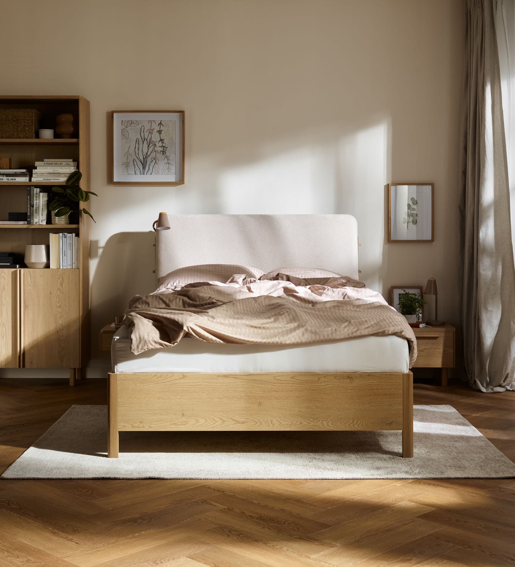 - Miękki tapicerowany zagłówek zwiększa komfort podczas czytania lub odpoczynku w pozycji siedzącej, a jego neutralna kolorystyka harmonijnie łączy się z ciepłym odcieniem drewna.