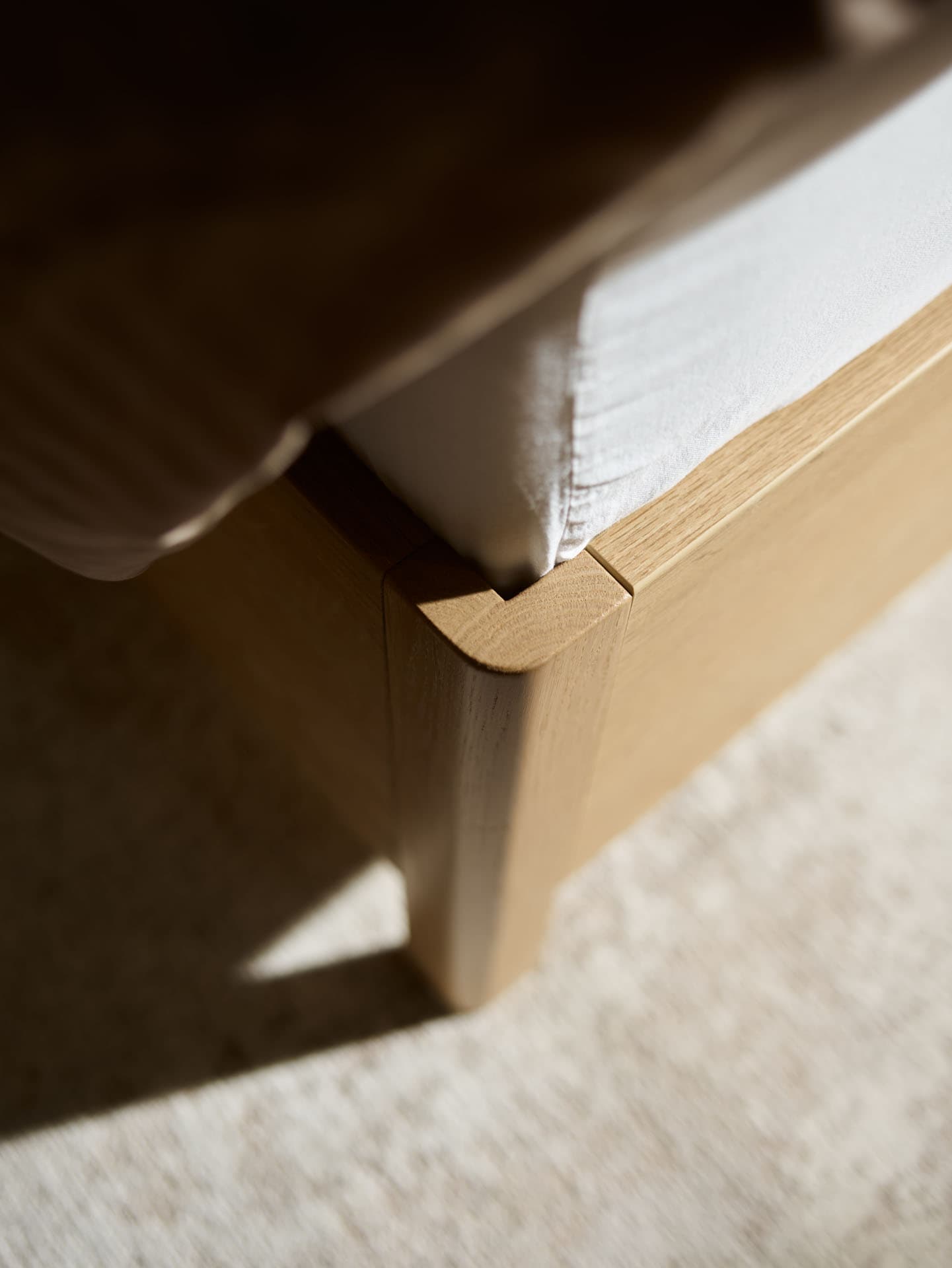 - Korpus łóżka osadzony jest na dębowych nogach, które unoszą bryłę nad podłogą, nadając jej lekkości i ułatwiając utrzymanie porządku w sypialni.