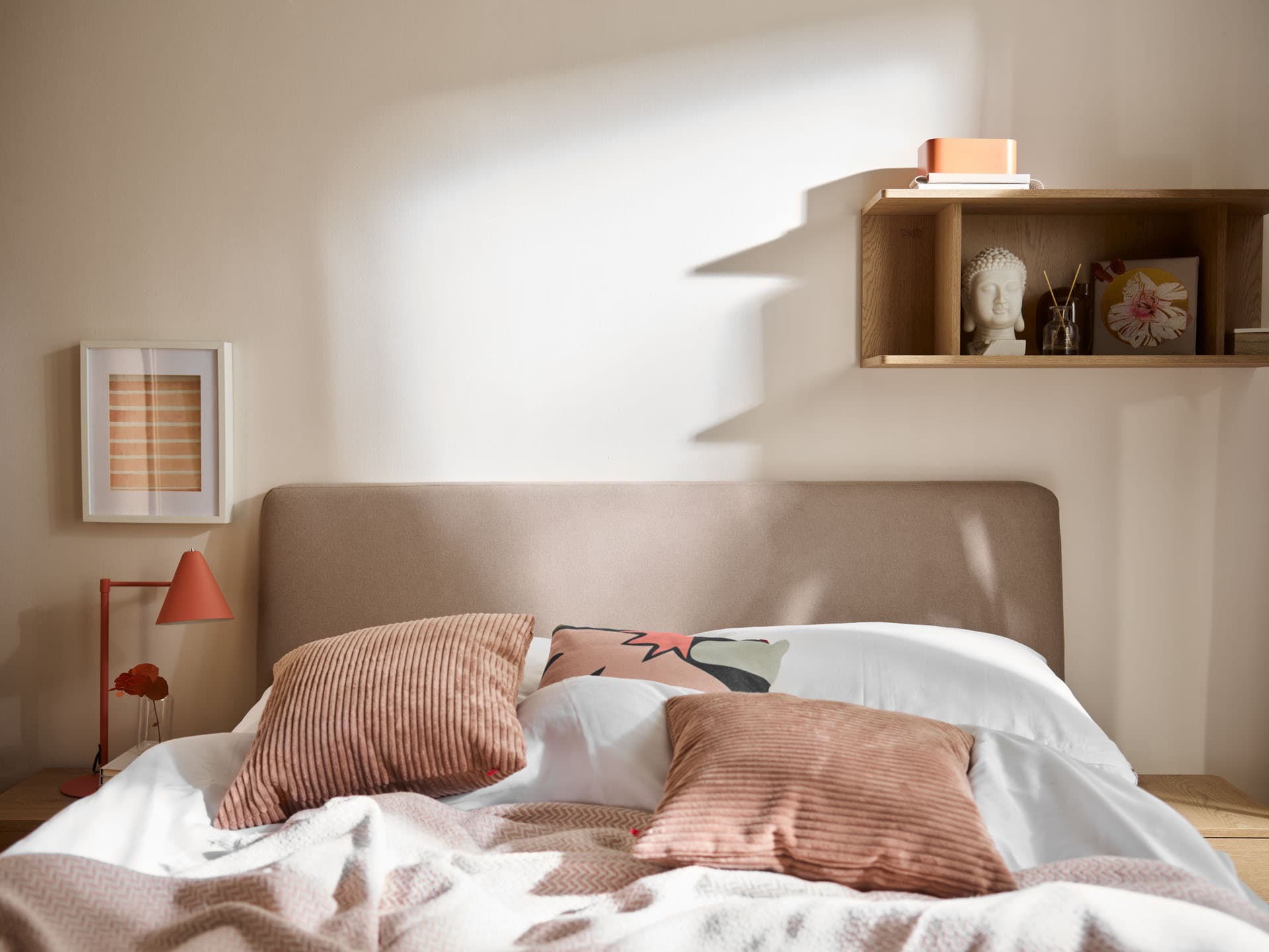 - Miękka, tapicerowana forma zagłówka wprowadza do wnętrza wrażenie przytulności i równoważy prostą, spokojną linię drewnianej ramy łóżka.