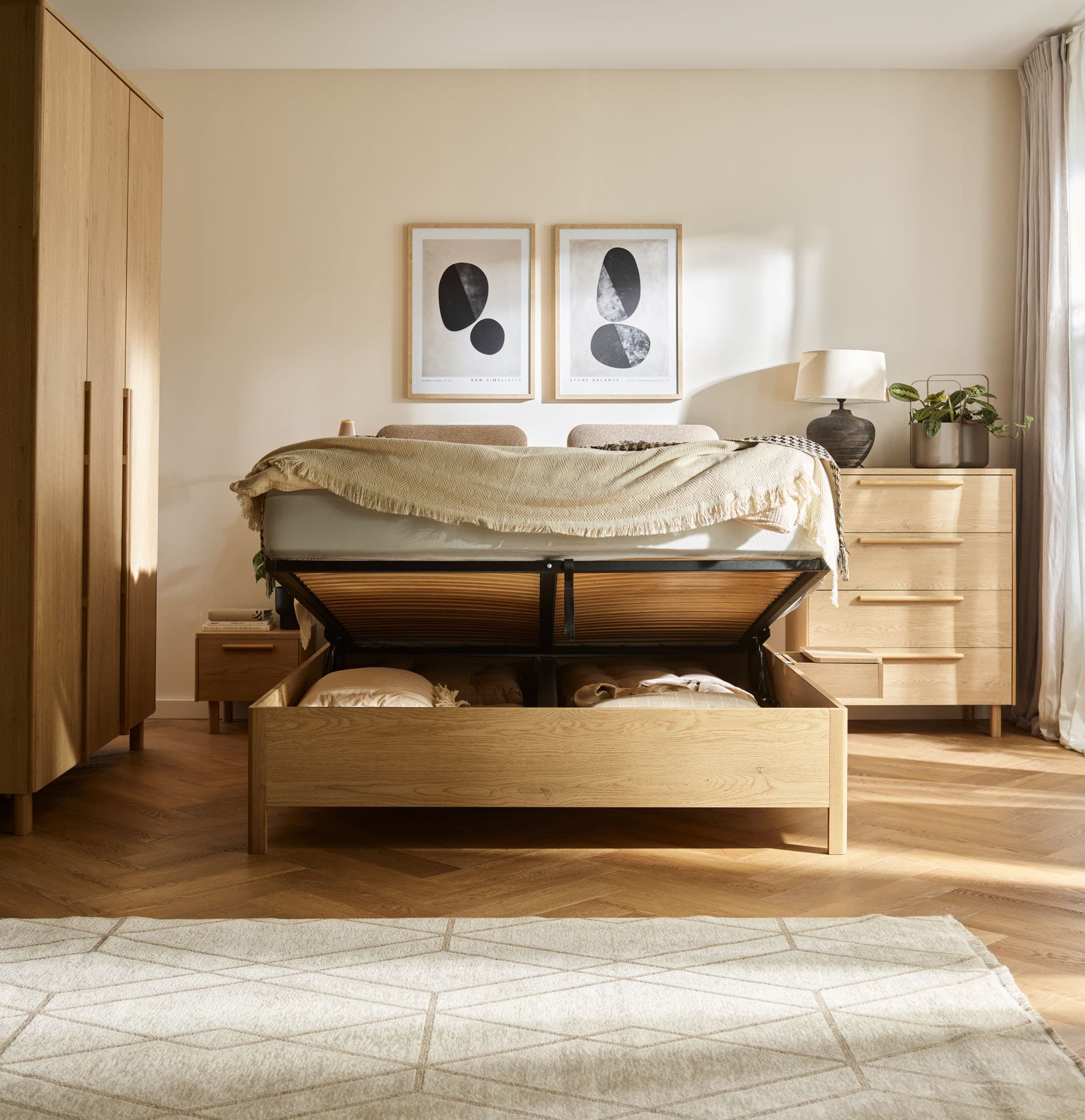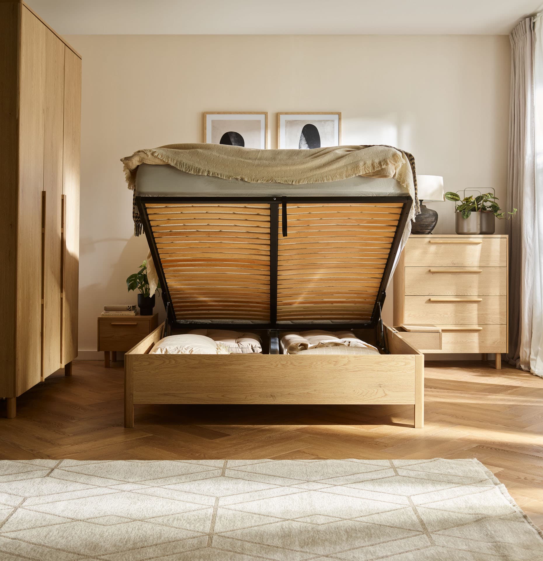 - Istnieje także możliwość zastosowania podnoszonego stelaża, który zwiększa funkcjonalność łóżka i zapewnia sprawny dostęp do przestrzeni pod materacem.