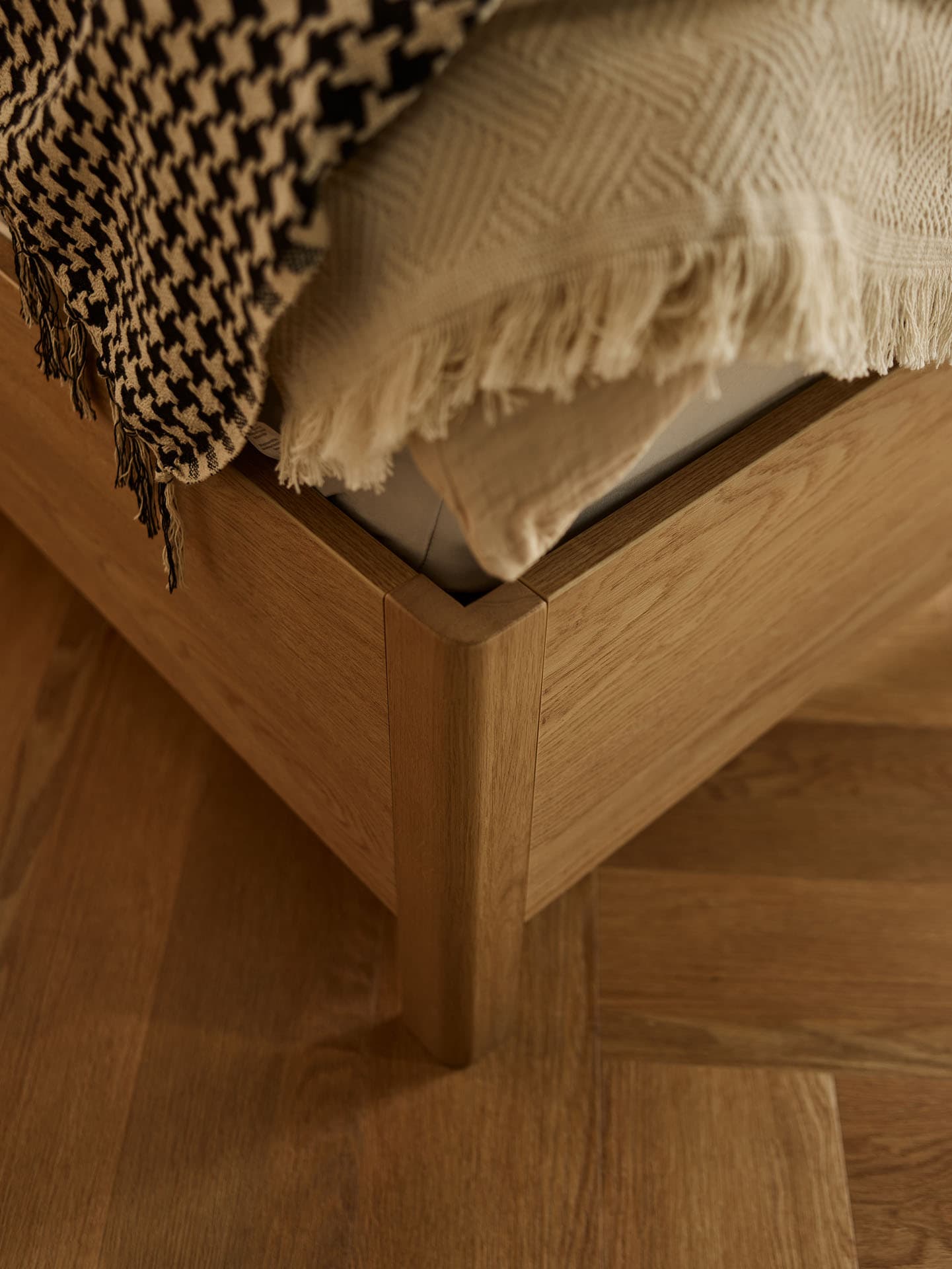 - Korpus łóżka osadzony jest na dębowych nogach, które unoszą bryłę nad podłogą, nadając jej lekkości i ułatwiając utrzymanie porządku w sypialni.