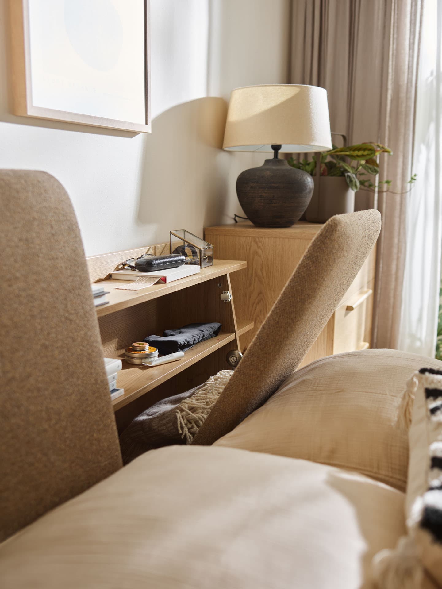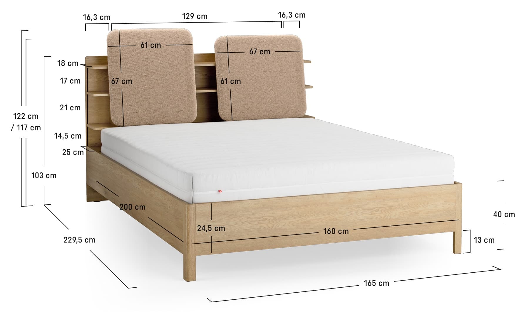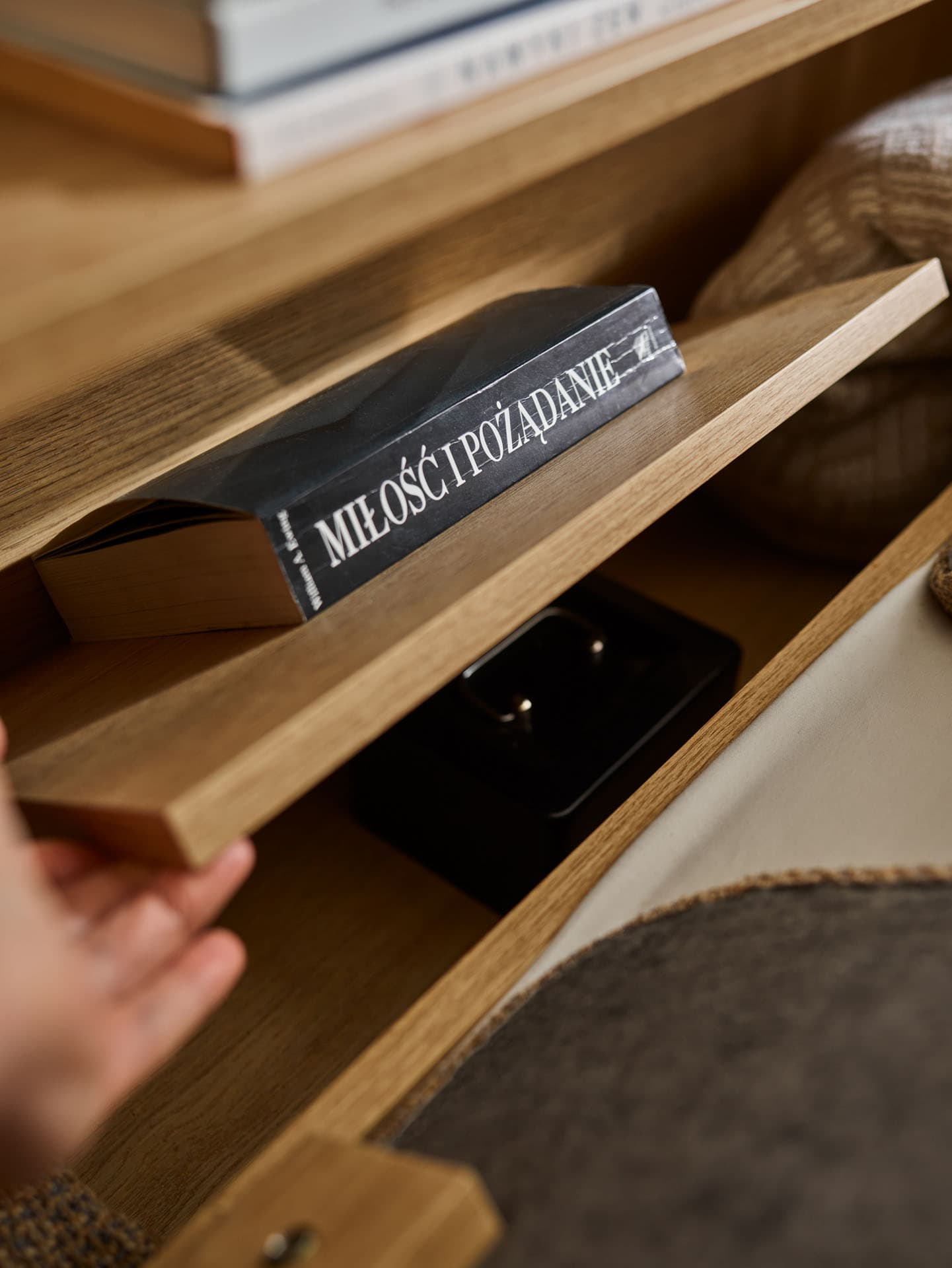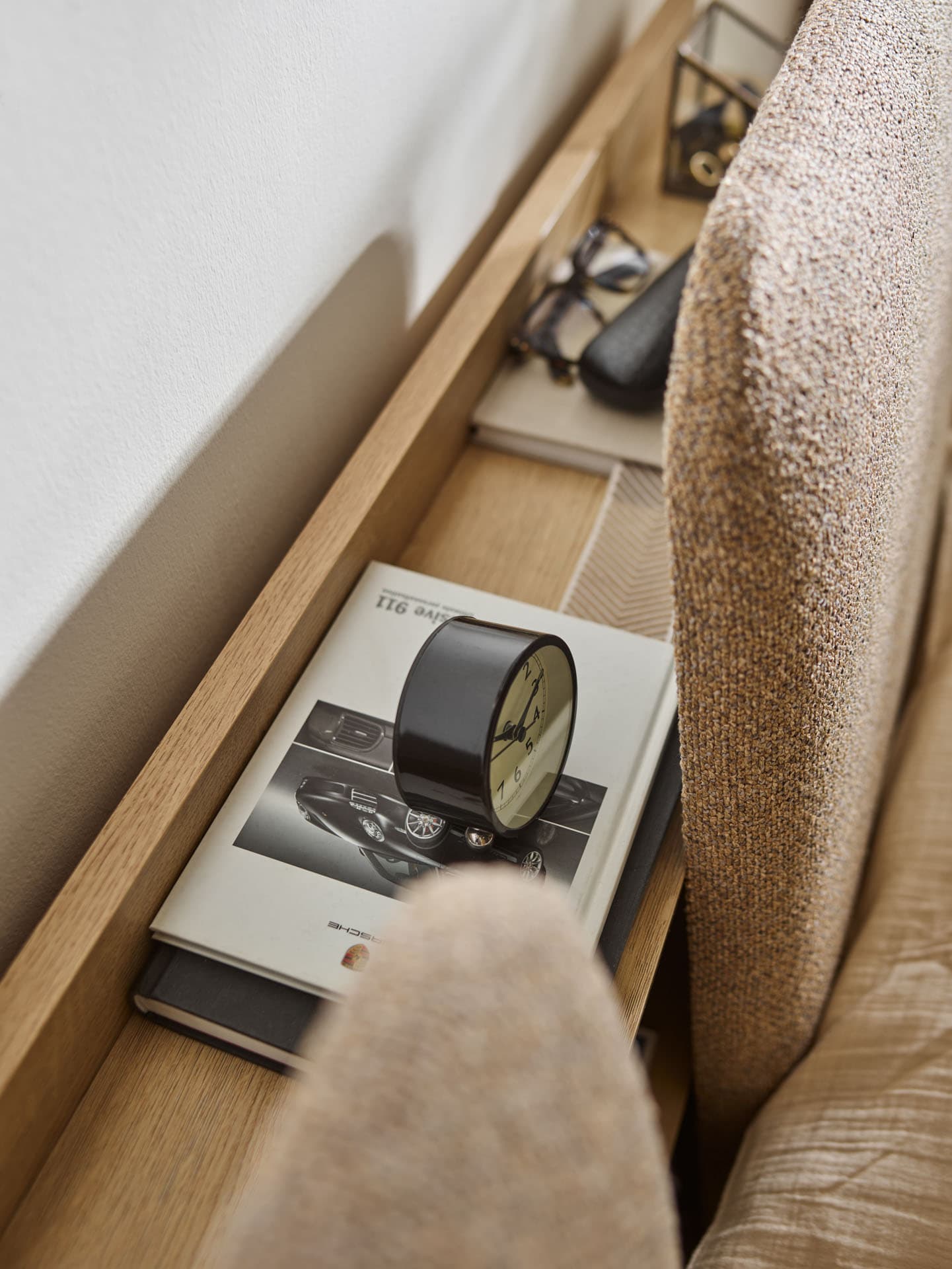 - Za dwoma tapicerowanymi oparciami, montowanymi niezależnie w pionie lub w poziomie, znajduje się pojemnik z półką, idealny na książki, drobne akcesoria czy przedmioty używane tuż przed snem.