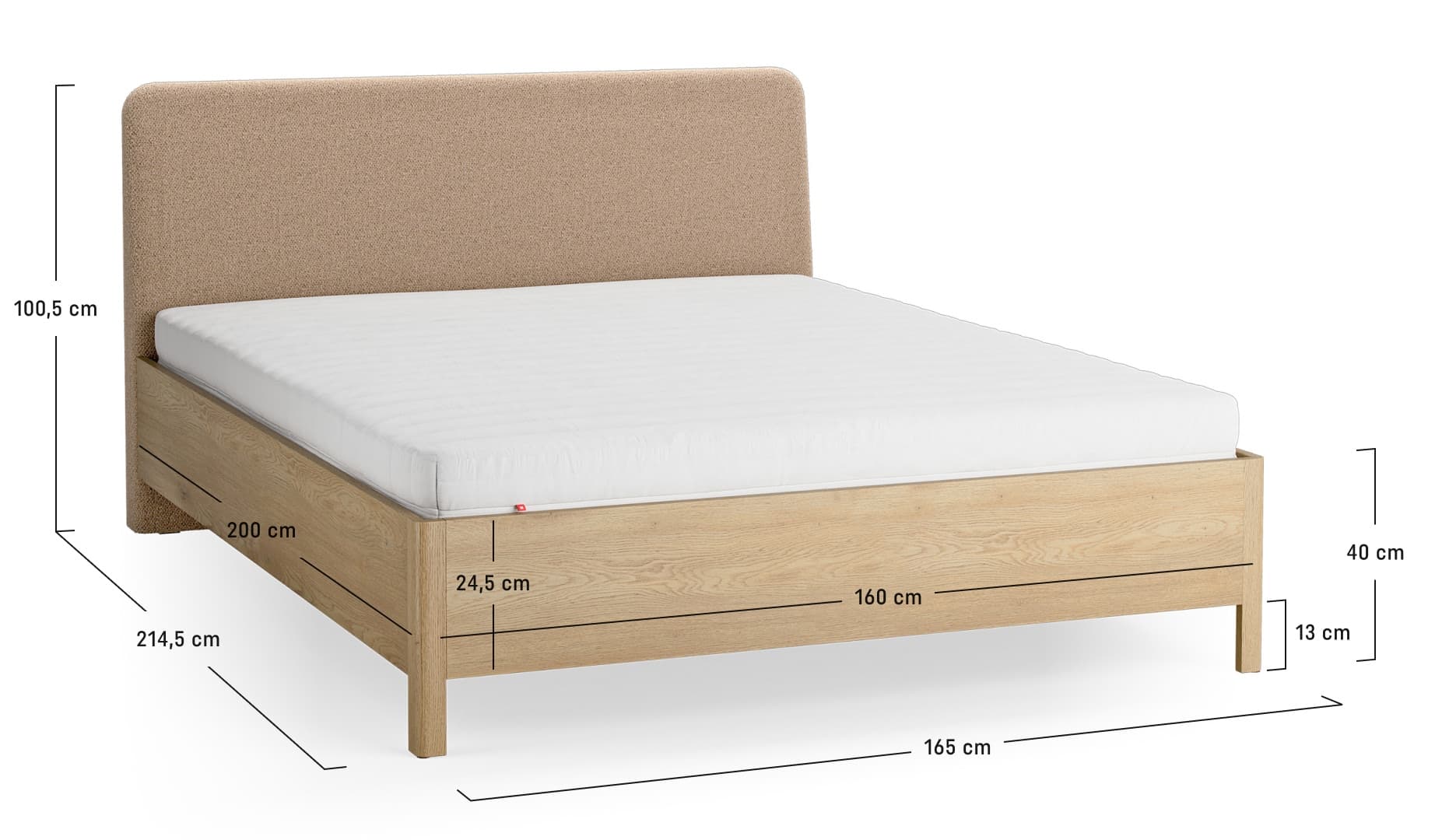 - Korpus łóżka osadzony jest na dębowych nogach, które unoszą bryłę nad podłogą, nadając jej lekkości i ułatwiając utrzymanie porządku w sypialni.