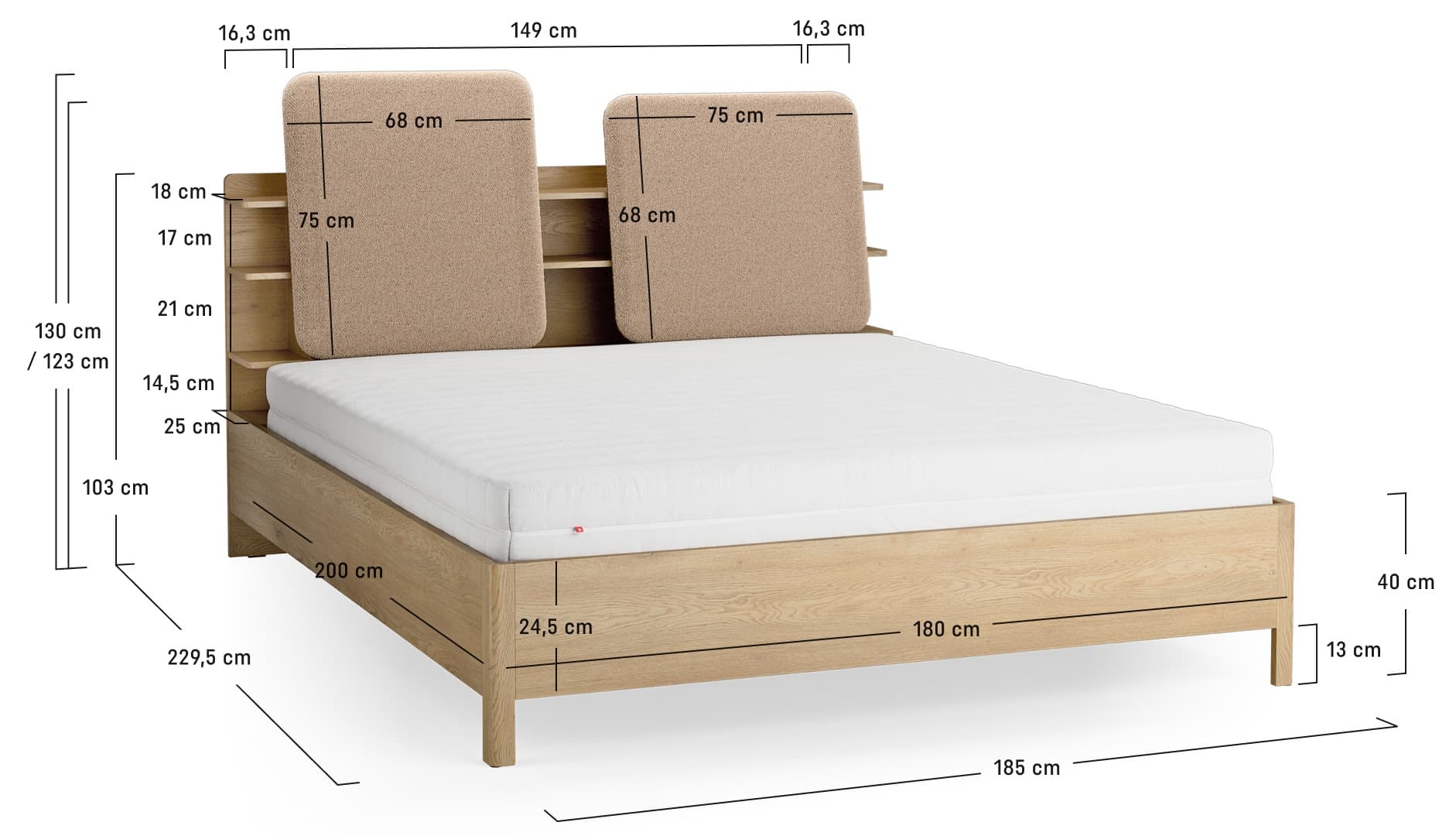 - Za dwoma tapicerowanymi oparciami, montowanymi niezależnie w pionie lub w poziomie, znajduje się pojemnik z półką, idealny na książki, drobne akcesoria czy przedmioty używane tuż przed snem.