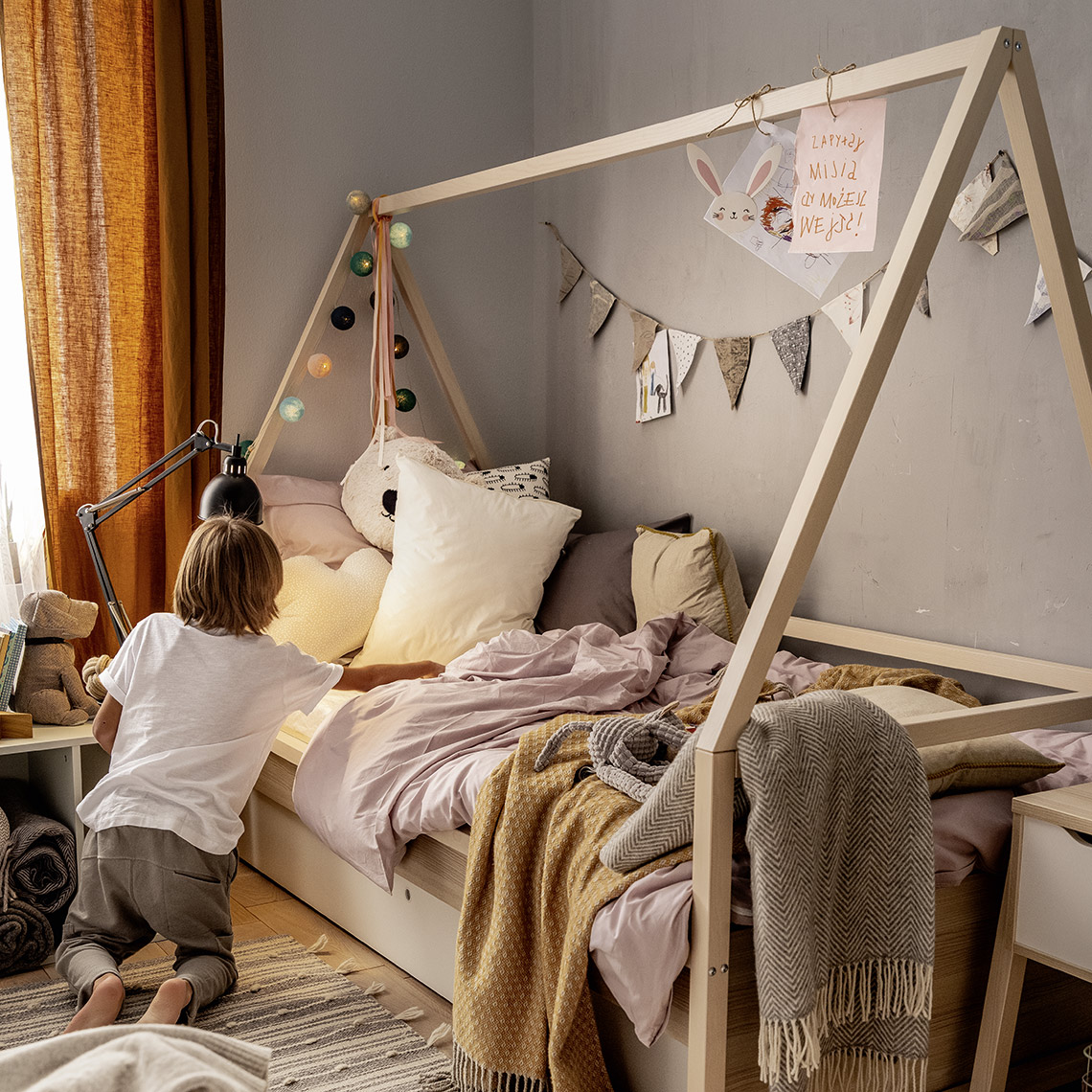- Do łóżka można dokupić mobilny wózek, który stworzy wesołą „bazę” do zabaw i przytulne miejsce do snu.
