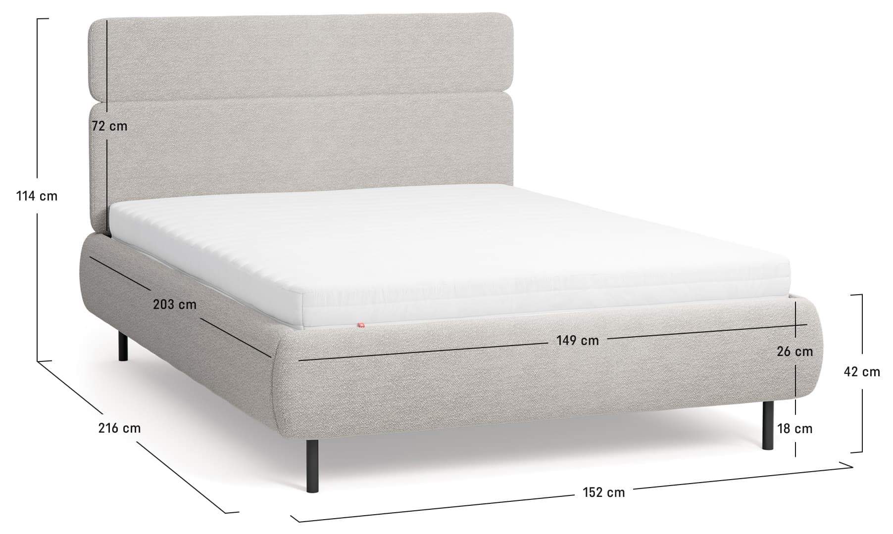 - Posiada tapicerowaną ramę i miękki, gładki zagłówek. Poziomy podział wezgłowia wyznacza strefy podparcia dla głowy i pleców. Delikatnie zaokrąglona forma mebla zwiększa komfort użytkowania.