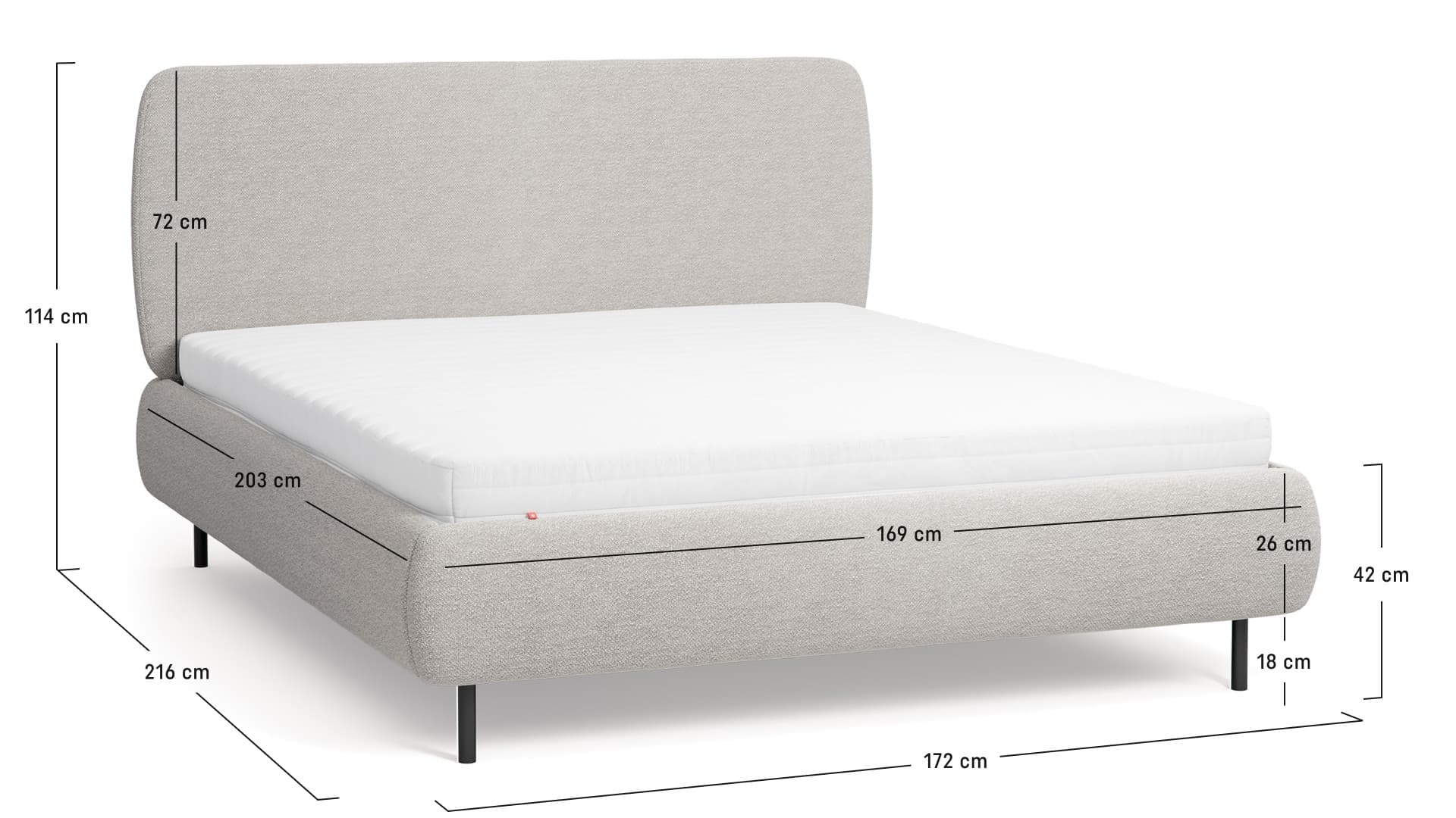 - Mebel dostępny jest w trzech szerokościach do wyboru: 140 cm, 160 cm i 180 cm, co pozwala dopasować go do różnych rozmiarów sypialni. Do łóżka należy dokupić materac o wymiarach odpowiadających ramie.