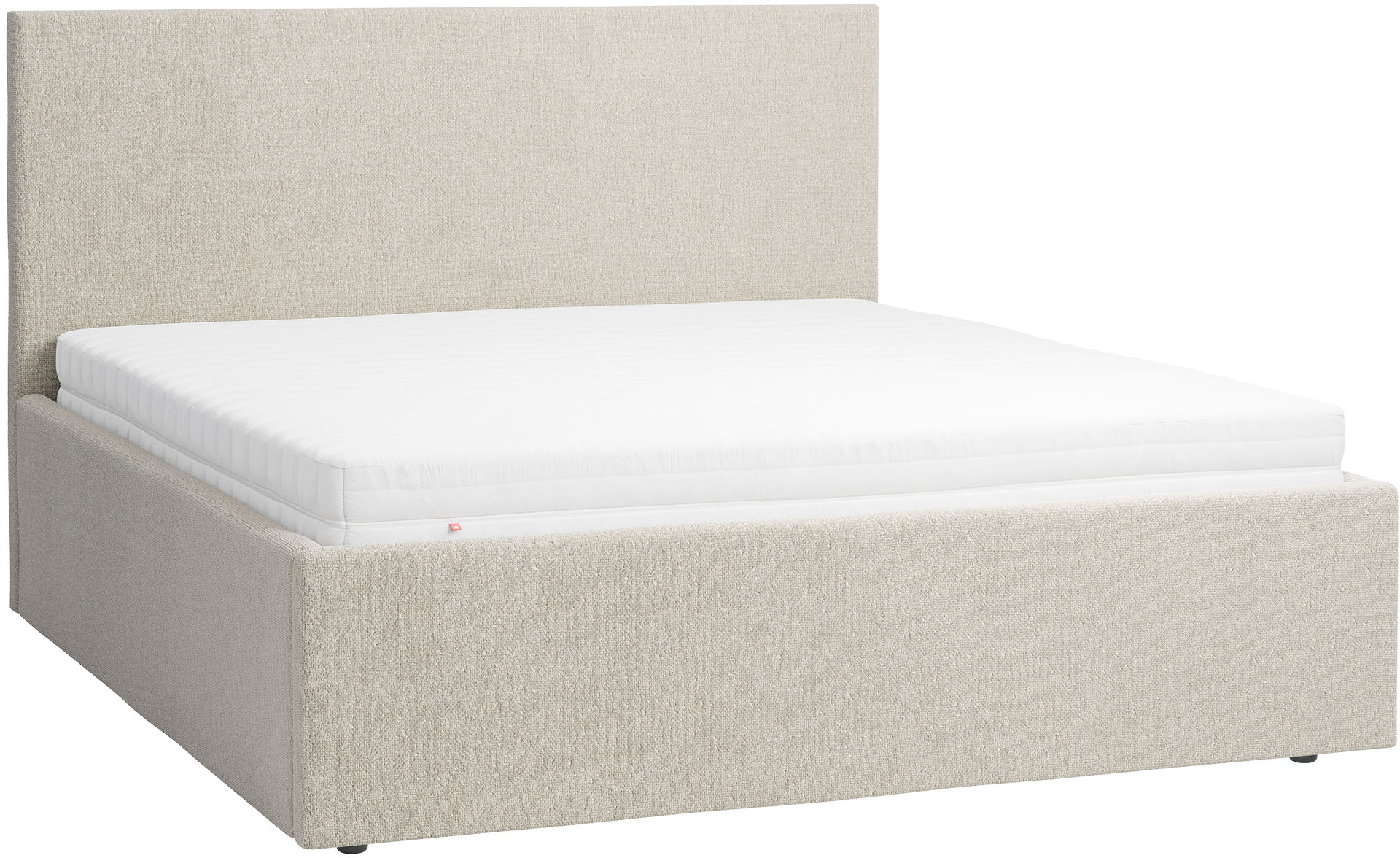 Miękkość oparcia to zasługa wypełnienia z pianki. Skrzynia jest wykonana z płyty meblowej, trwałej i wytrzymałej, pokryta wybraną tkaniną. Metalowy stelaż łóżka posiada listwy sprężynujące (48 sztuk, rozstaw co 2,3 cm) i podnośnik gazowy (1000N). Montaż stelaża możliwy jest na 3 poziomach co 6,4 cm. Pojemnik wykonano z białej płyty meblowej, a jego dno z płyty HDF. Całość opiera się na solidnych nóżkach z tworzywa. Tył zagłówka jest wykończony tkaniną techniczną.