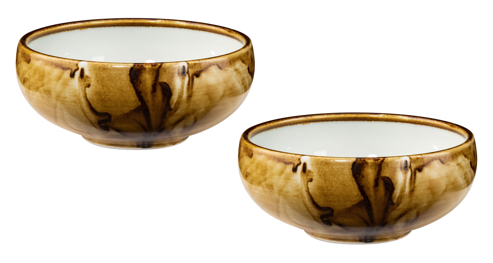 Szkliwienie reaktywne na zewnętrznej powierzchni naczyń kreuje zamierzony efekt przebarwień i nieregularnego rozmieszczenia kolorów.
