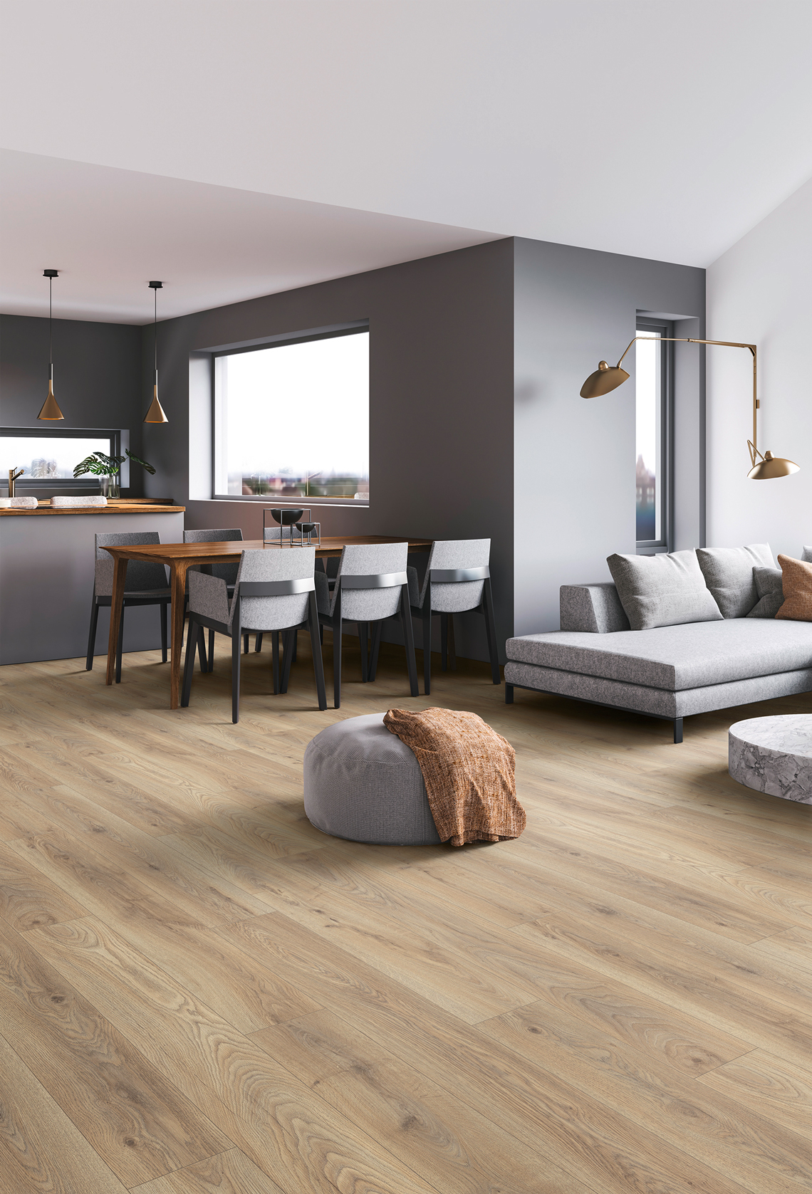 Panele podłogowe Kronooriginal Organic Clever Silent Ashland Oak K452 to stylowe i trwałe rozwiązanie do nowoczesnych wnętrz. Jasny, naturalny dekor dębu Ashland Oak o delikatnym usłojeniu rozjaśnia przestrzeń i nadaje jej świeżości. Panele mają wymiary 1288 x 195 mm, grubość 7 mm oraz wysoką klasę ścieralności AC5, co gwarantuje wyjątkową odporność na zużycie – nawet w intensywnie użytkowanych pomieszczeniach. Dodatkowo technologia Clever Silent zapewnia wyciszenie kroków i komfort użytkowania. Produkt objęty jest 20-letnią gwarancją, co potwierdza jego wysoką jakość i niezawodność.