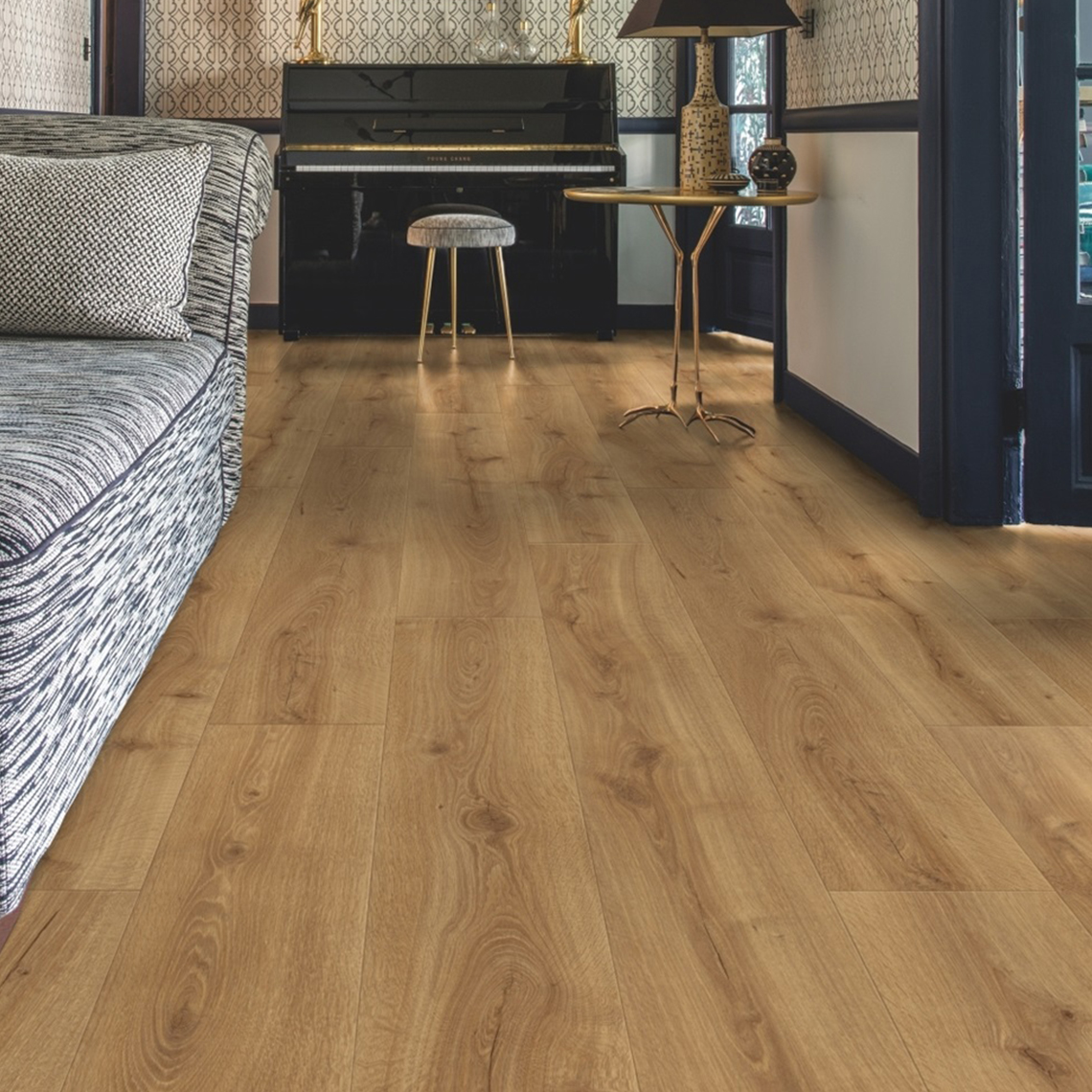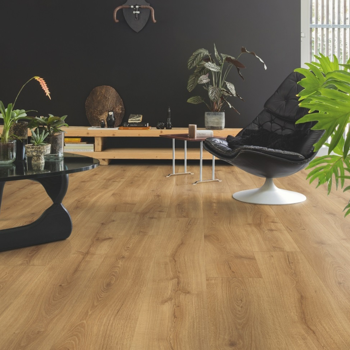 Panele podłogowe Dąb Pustynny Naturalny Ciepły MJ3551 to doskonały wybór dla tych, którzy pragną piękna i trwałości. Dzięki wodoodpornej powłoce HydroSeal nie musisz się martwić o przenikanie wody, a czterostronna fuga doda autentycznego wyglądu drewnianej podłodze. Szerokie i długie deski (205x24cm) optycznie powiększą wnętrze Twojego domu. Klasa 32 i matowe wykończenie nadają podłodze elegancki, niepołyskliwy wygląd. Dożywotnia gwarancja producenta Quick Step sprawia, że to inwestycja na lata.