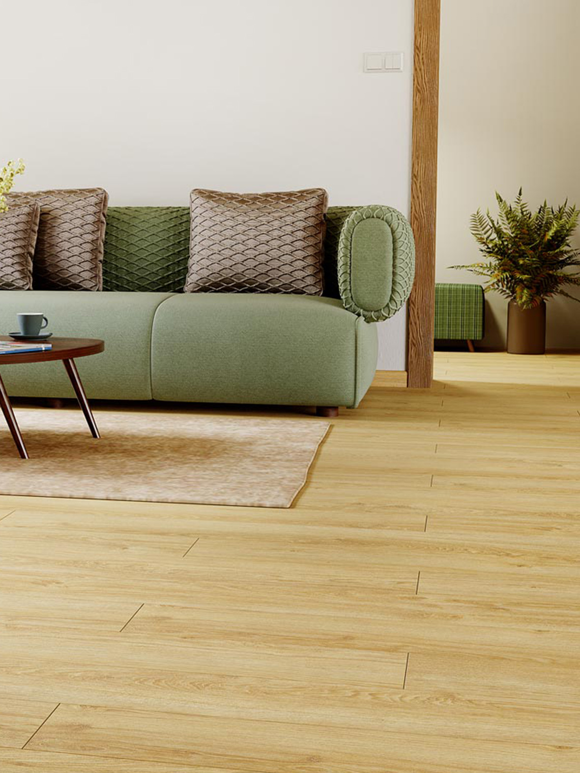 Panele SWISS KRONO Aurum Dolce Aqua Zero Dąb Grappa D40054 to elegancki wybór z kolekcji Dolce Aqua Zero, wyróżniający się subtelnym, naturalnym odcieniem inspirowanym szlachetnym drewnem dębowym. Jasnobrązowa barwa „Dąb Grappa” wprowadza do wnętrza ciepło i harmonię, doskonale komponując się z różnorodnymi stylami aranżacji, od klasycznych po nowoczesne. Synchroniczna struktura paneli realistycznie odwzorowuje usłojenie drewna, zapewniając autentyczny wygląd i elegancki charakter.