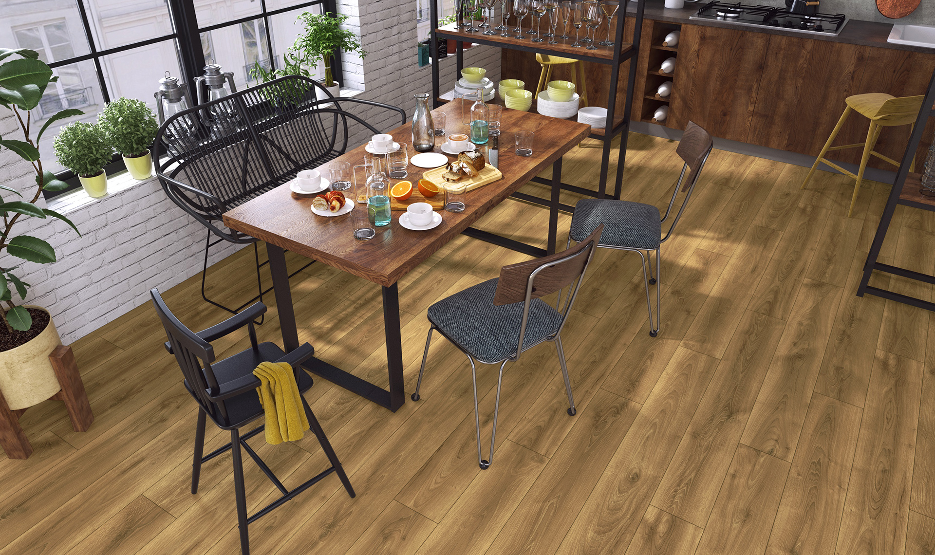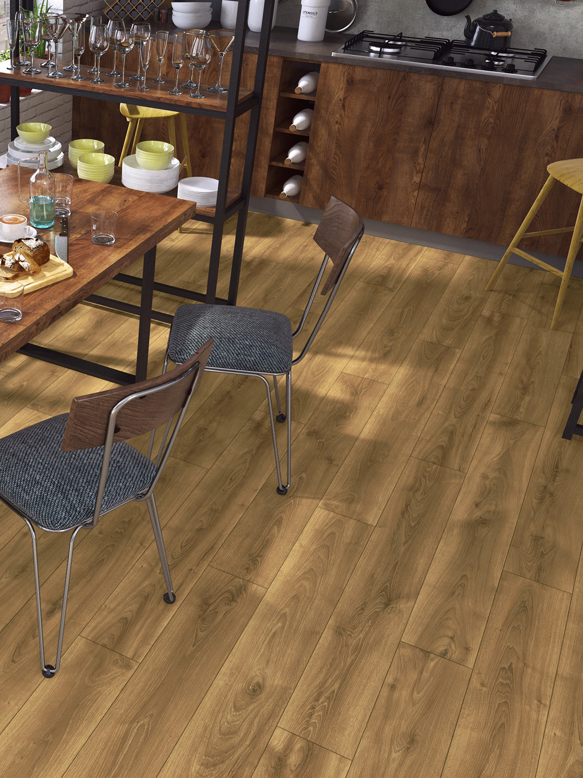 Panele przygotowane na wodoodpornej płycie 12-milimetrowej, z wyjątkowo szczelnym zamkiem Aqua Pearl, gwarantują odporność na 24* godziny, od momentu wylania. Są wynikiem 50-letniego doświadczenia pracy z drewnem SWISS KRONO i dzięki innowacyjnej technologii stanowią rozwiązanie wielu trudnych sytuacji naszego życia.