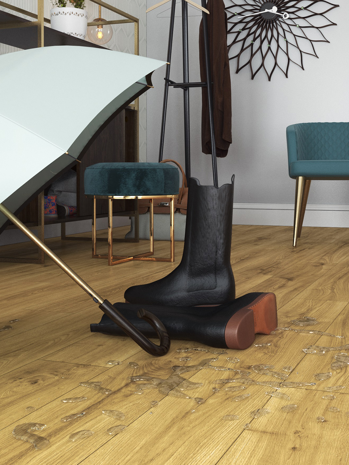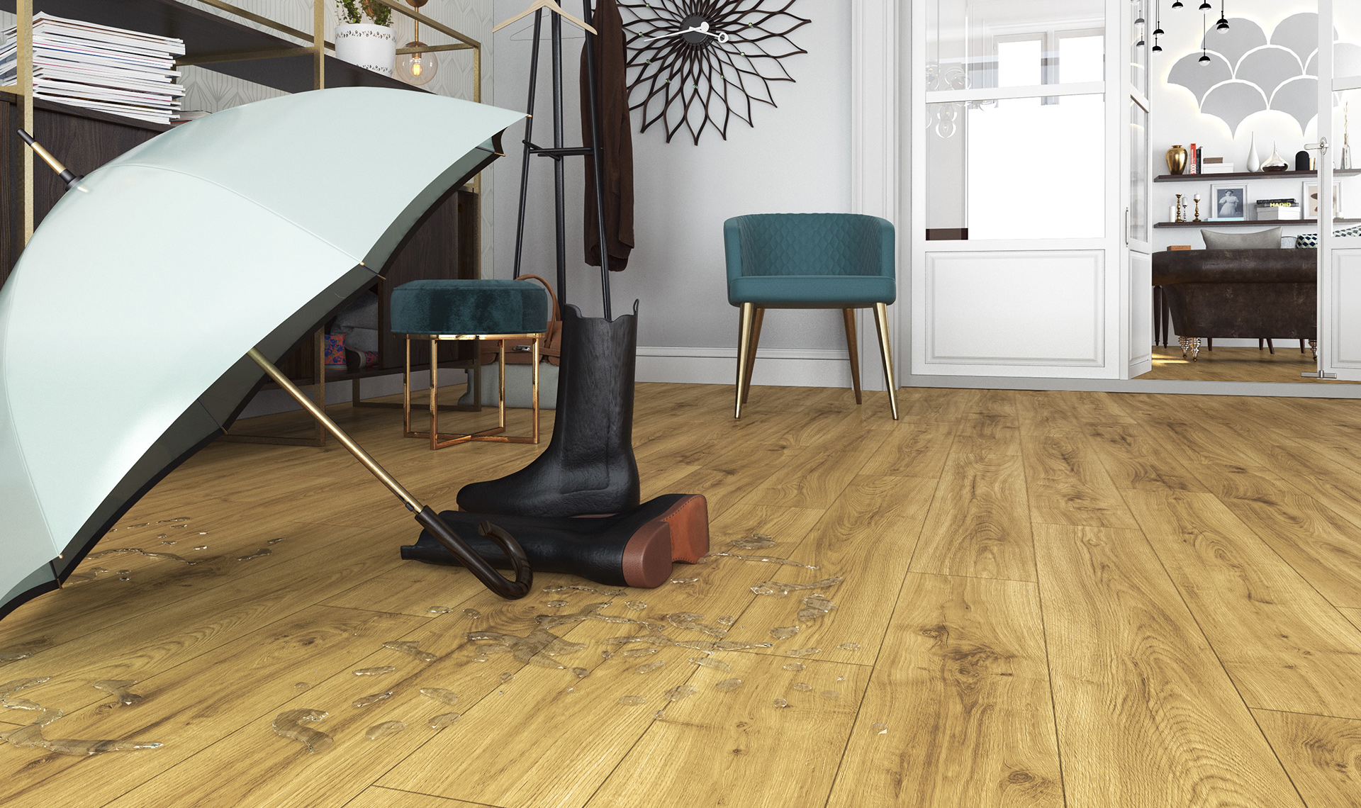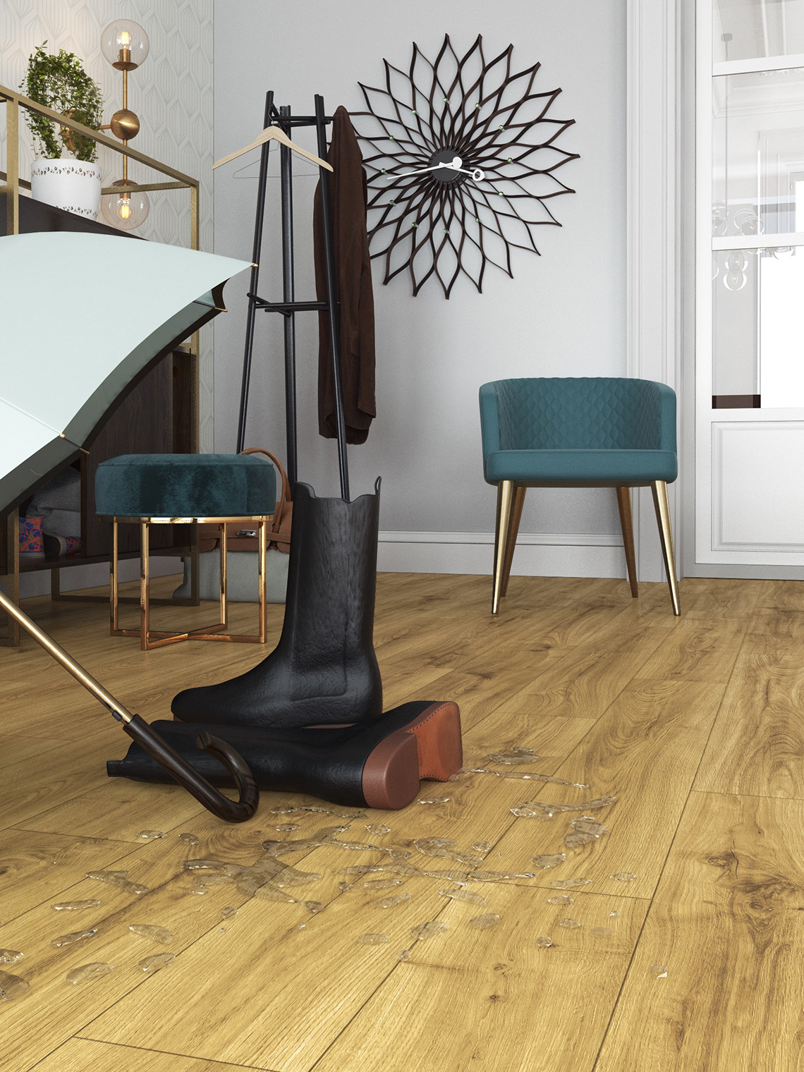 Panele przygotowane na wodoodpornej płycie 12-milimetrowej, z wyjątkowo szczelnym zamkiem Aqua Pearl, gwarantują odporność na 24* godziny, od momentu wylania. Są wynikiem 50-letniego doświadczenia pracy z drewnem SWISS KRONO i dzięki innowacyjnej technologii stanowią rozwiązanie wielu trudnych sytuacji naszego życia.