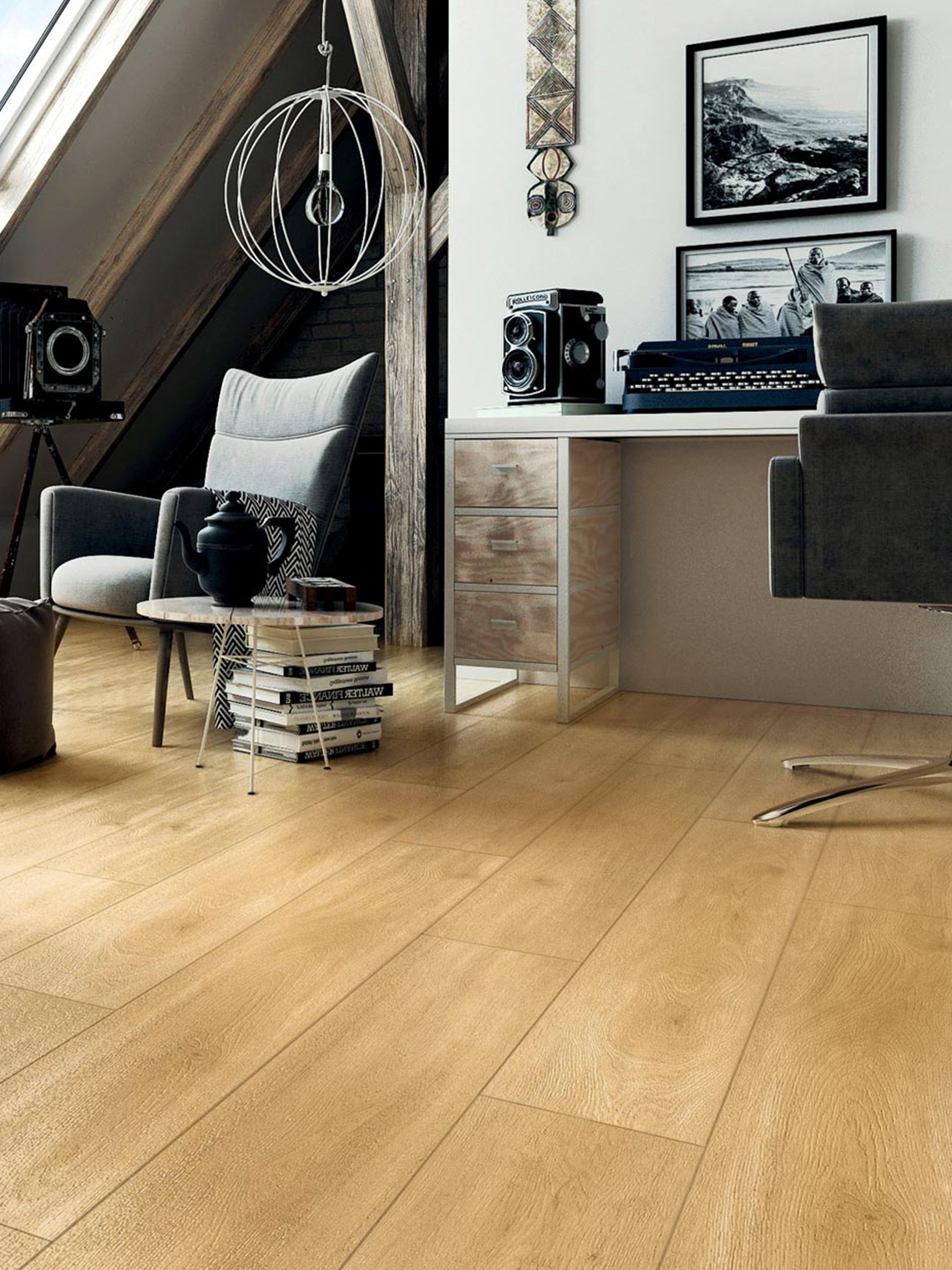 Panele te posiadają klasę ścieralności AC5, co oznacza, że są wysoce odporne na zarysowania, ścieranie oraz intensywne użytkowanie, dzięki czemu są idealnym rozwiązaniem do miejsc o dużym natężeniu ruchu, takich jak salony, kuchnie, biura, a także przestrzenie komercyjne. Grubość 10 mm dodatkowo zwiększa stabilność podłogi, zapewniając komfort chodzenia oraz doskonałe tłumienie dźwięków.
