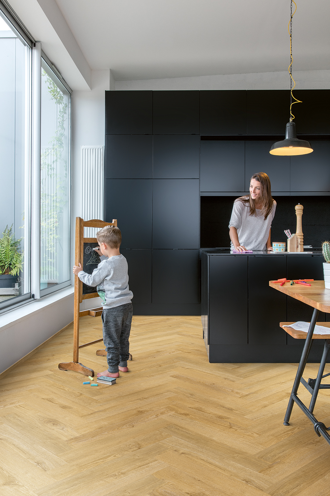 Kolekcja winylowych podłóg Pristine w jodełkę łączy klasyczny styl z nowoczesnym wzornictwem, nadając wnętrzu wyjątkowy charakter. Wybierając wodoodporne podłogi Quick-Step, nie musisz martwić się o wilgoć – oferują 100% odporność na wodę, co ułatwia czyszczenie. Dodatkowo, technologia Scratch Guard zapewnia dziesięciokrotną odporność na zarysowania w porównaniu do tradycyjnych podłóg.