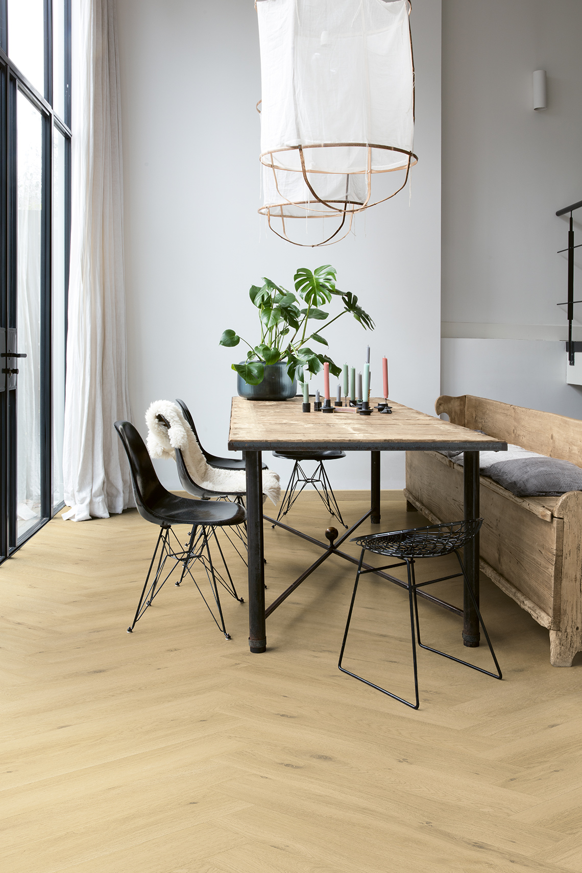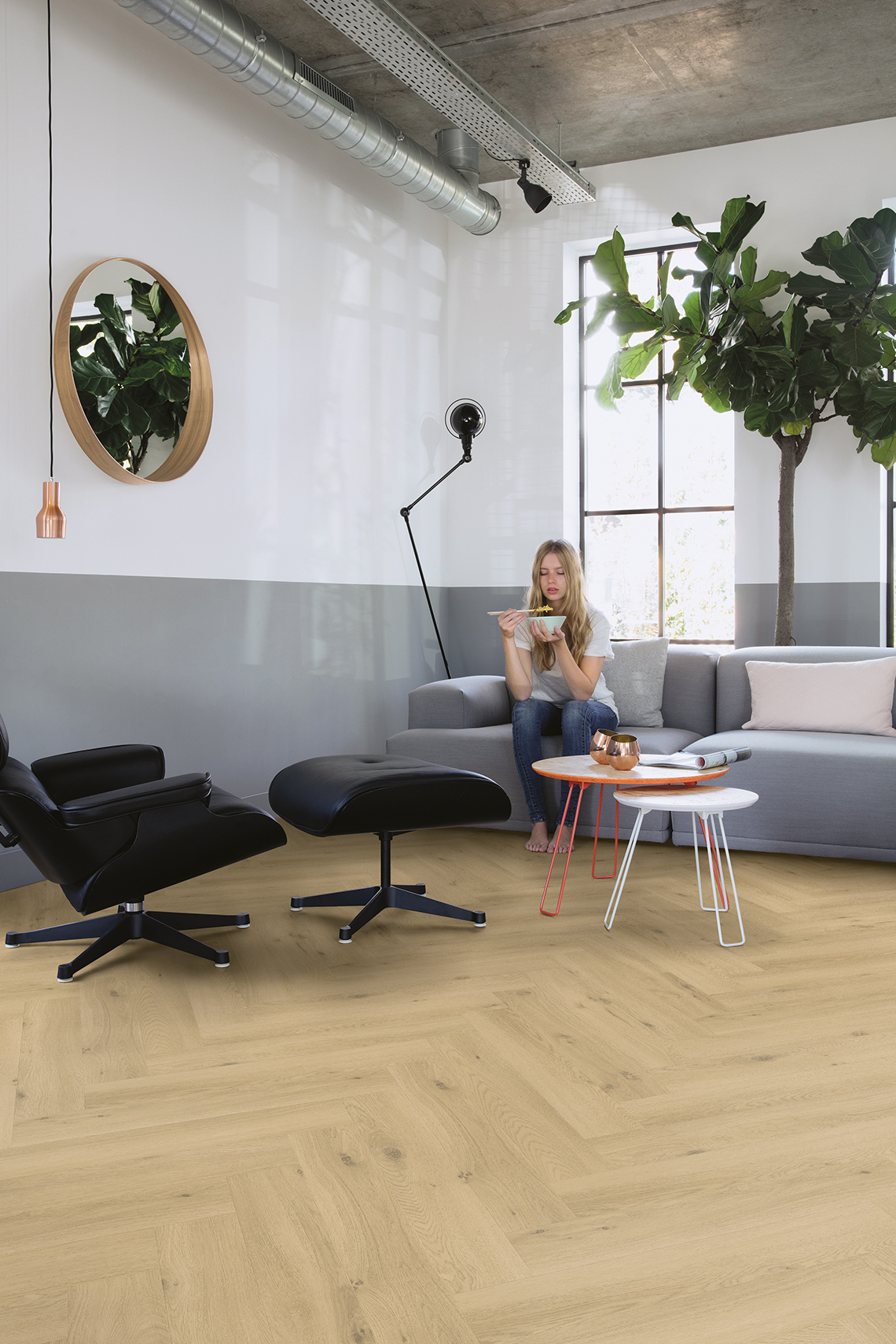 Kolekcja winylowych podłóg Pristine w jodełkę łączy klasyczny styl z nowoczesnym wzornictwem, nadając wnętrzu wyjątkowy charakter. Wybierając wodoodporne podłogi Quick-Step, nie musisz martwić się o wilgoć – oferują 100% odporność na wodę, co ułatwia czyszczenie. Dodatkowo, technologia Scratch Guard zapewnia dziesięciokrotną odporność na zarysowania w porównaniu do tradycyjnych podłóg.