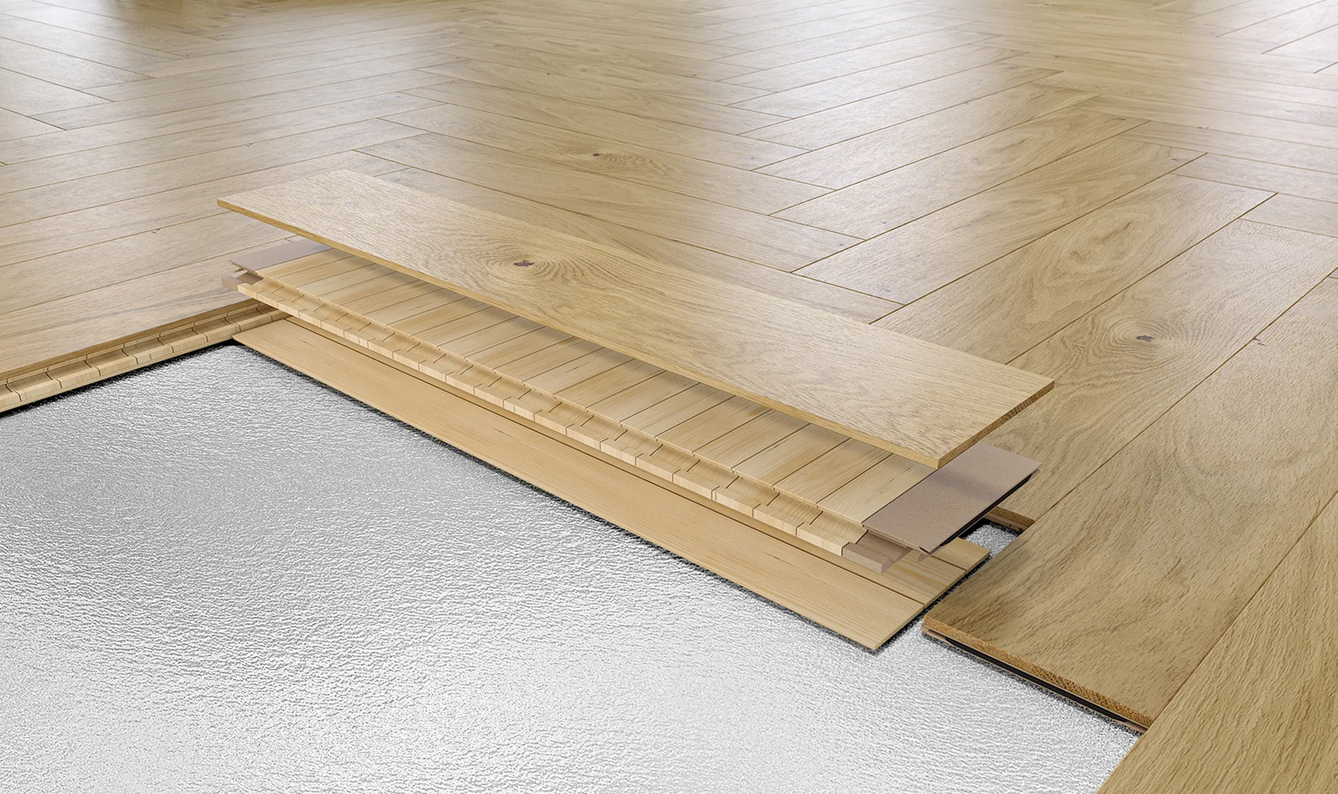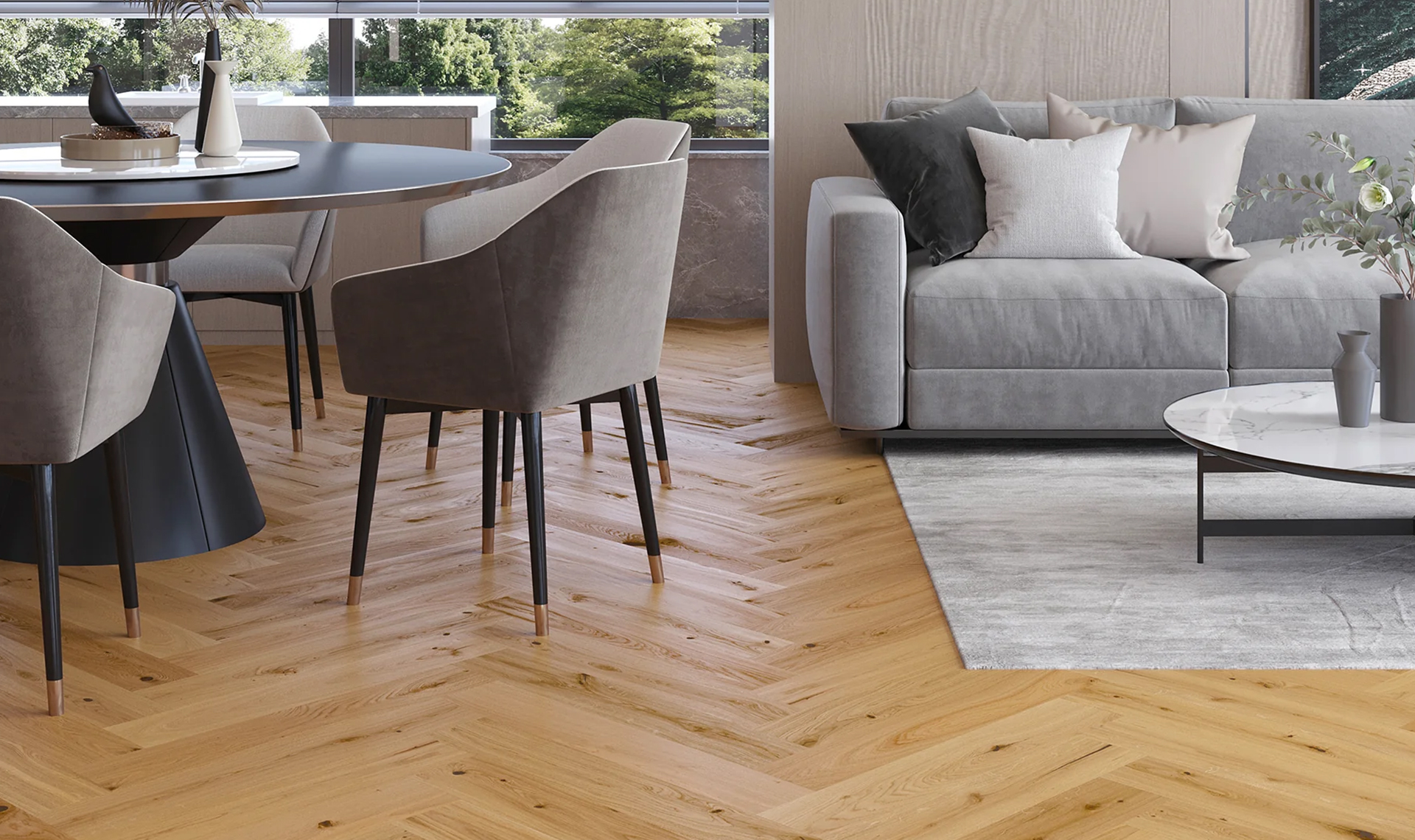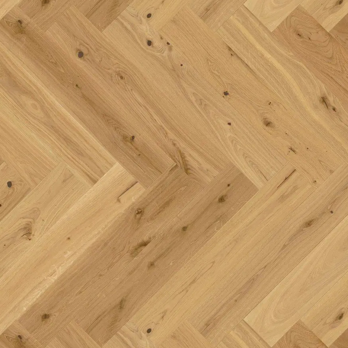 Dębowa podłoga o rustykalnym wyglądzie. Struktura drewna została podkreślona szczotkowaniem, a krawędzie deski podkreślone mikrofazowaniem. Pokryta matowym lakierem.