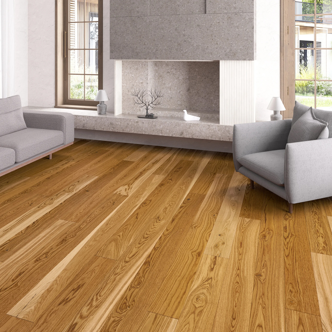 Charakteryzuje się dowolnością rysunku słojów i kolorystką drewna dębowego. Czterostronna faza wydłuża optycznie deskę, a szczotkowanie podkreśla jej naturalny charakter. Podłoga wykończona lakierem matowym.