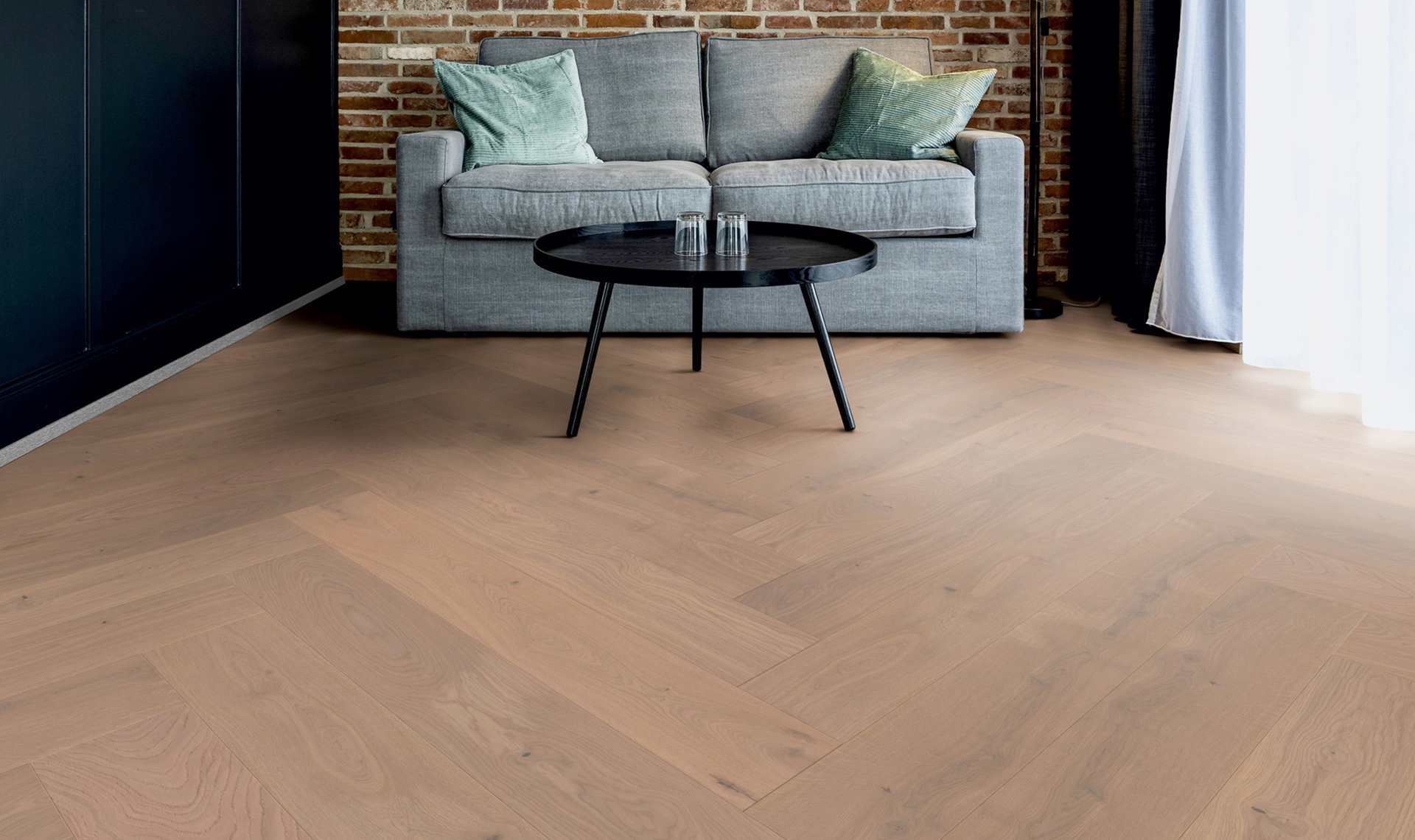 Podłoga drewniana Ter Hürne Herringbone Collection Dąb Amrum wyróżnia się naturalnym, jasnym odcieniem dębu, który wnosi do wnętrza ciepło i przytulną atmosferę. Wzór jodełki nadaje podłodze elegancki i klasyczny charakter, idealnie podkreślając styl zarówno nowoczesnych, jak i tradycyjnych aranżacji. Solidne wykonanie gwarantuje trwałość, stabilność oraz odporność na codzienne użytkowanie. To podłoga, która łączy ponadczasowe piękno drewna z wyjątkową estetyką i funkcjonalnością.