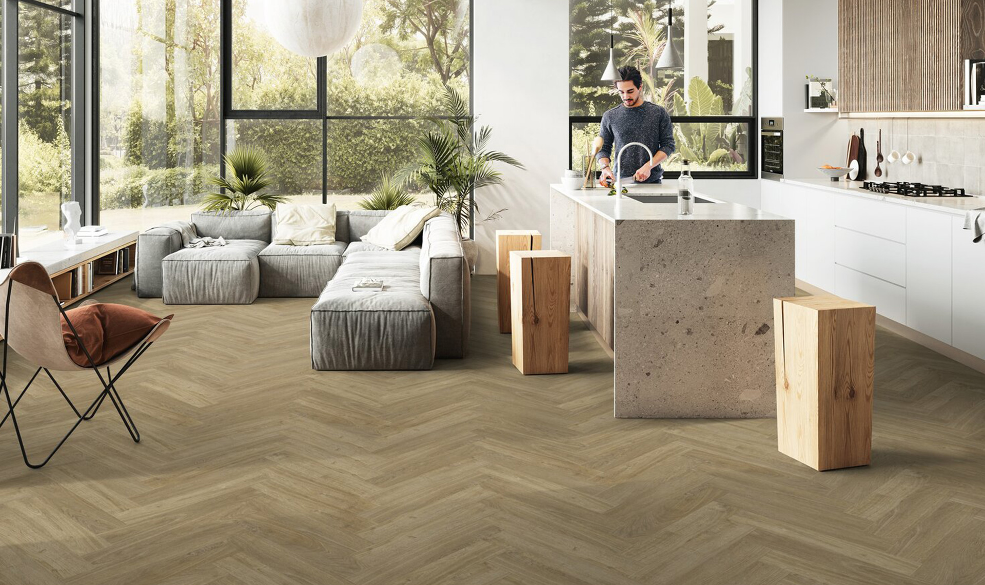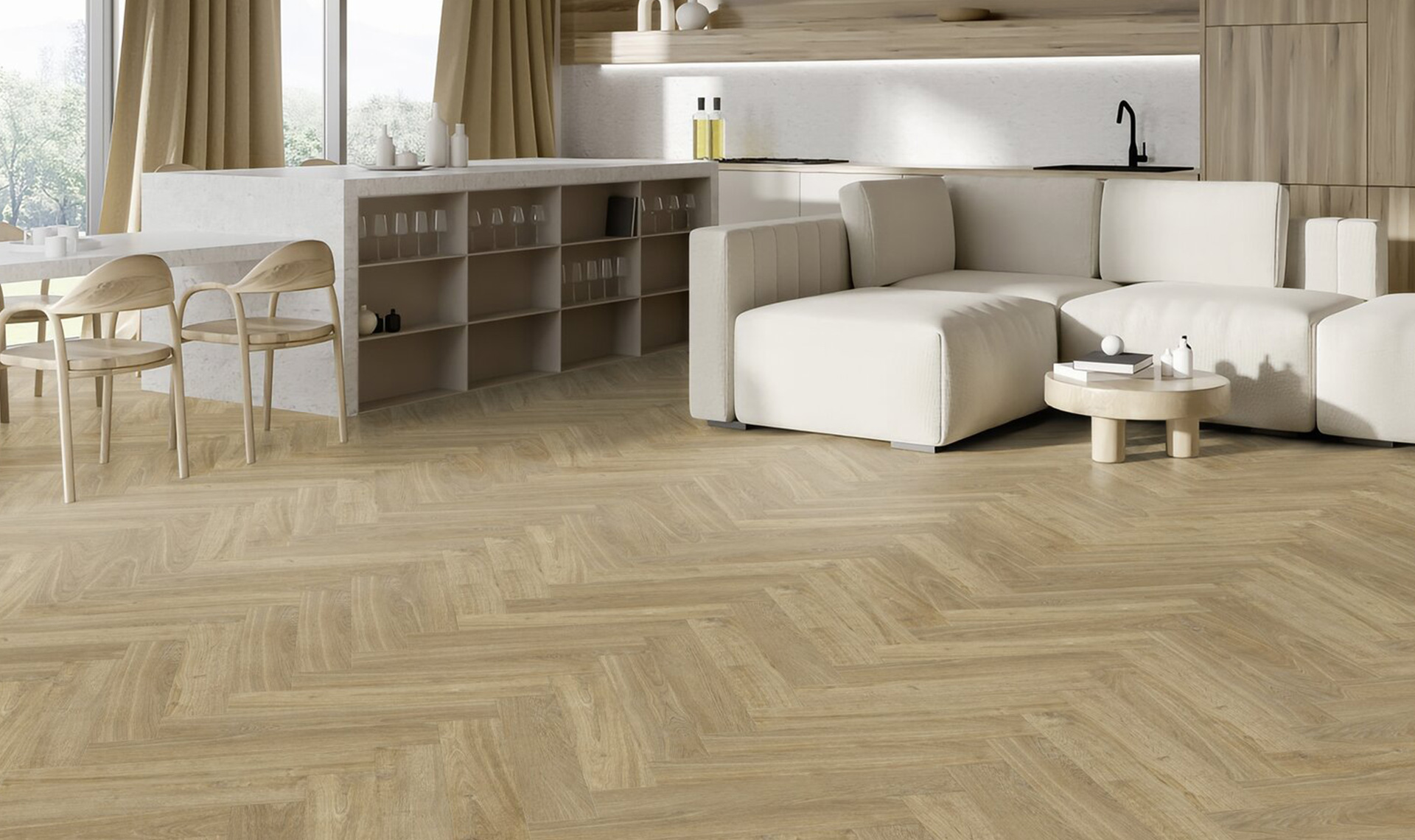 Podłoga winylowa Gerflor Senso Unik Herringbone Madera Natural to elegancka imitacja drewna w klasycznym wzorze jodełki, która doskonale wpisuje się w nowoczesne i stylowe wnętrza. Jej naturalny odcień i subtelna struktura drewna wprowadzają do pomieszczenia ciepło i przytulność, jednocześnie zachowując funkcjonalność i trwałość materiału winylowego.