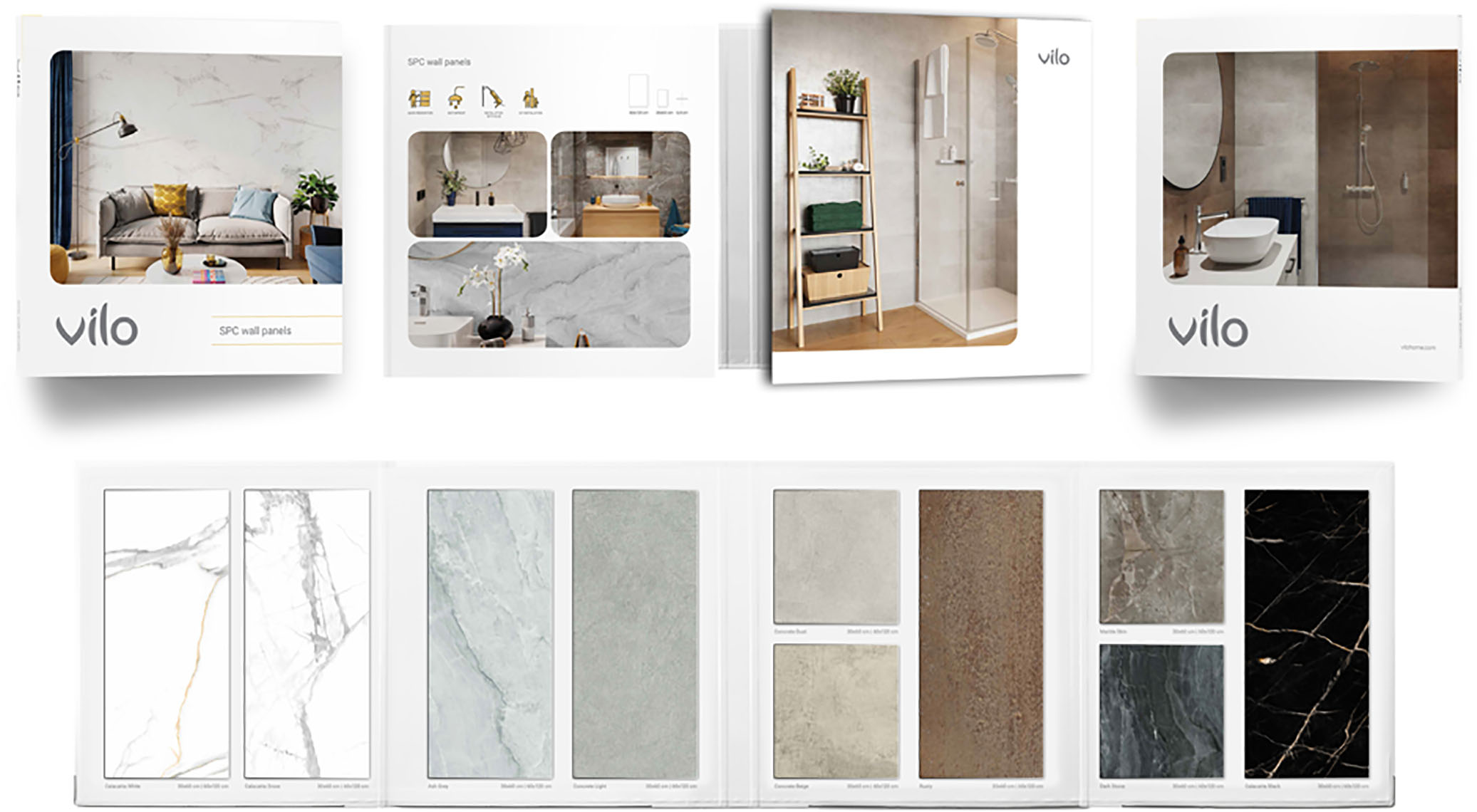 Wzornik zawiera 10 próbek paneli ściennych SPC. Próbki są na stałe przyklejone do wzornika.
