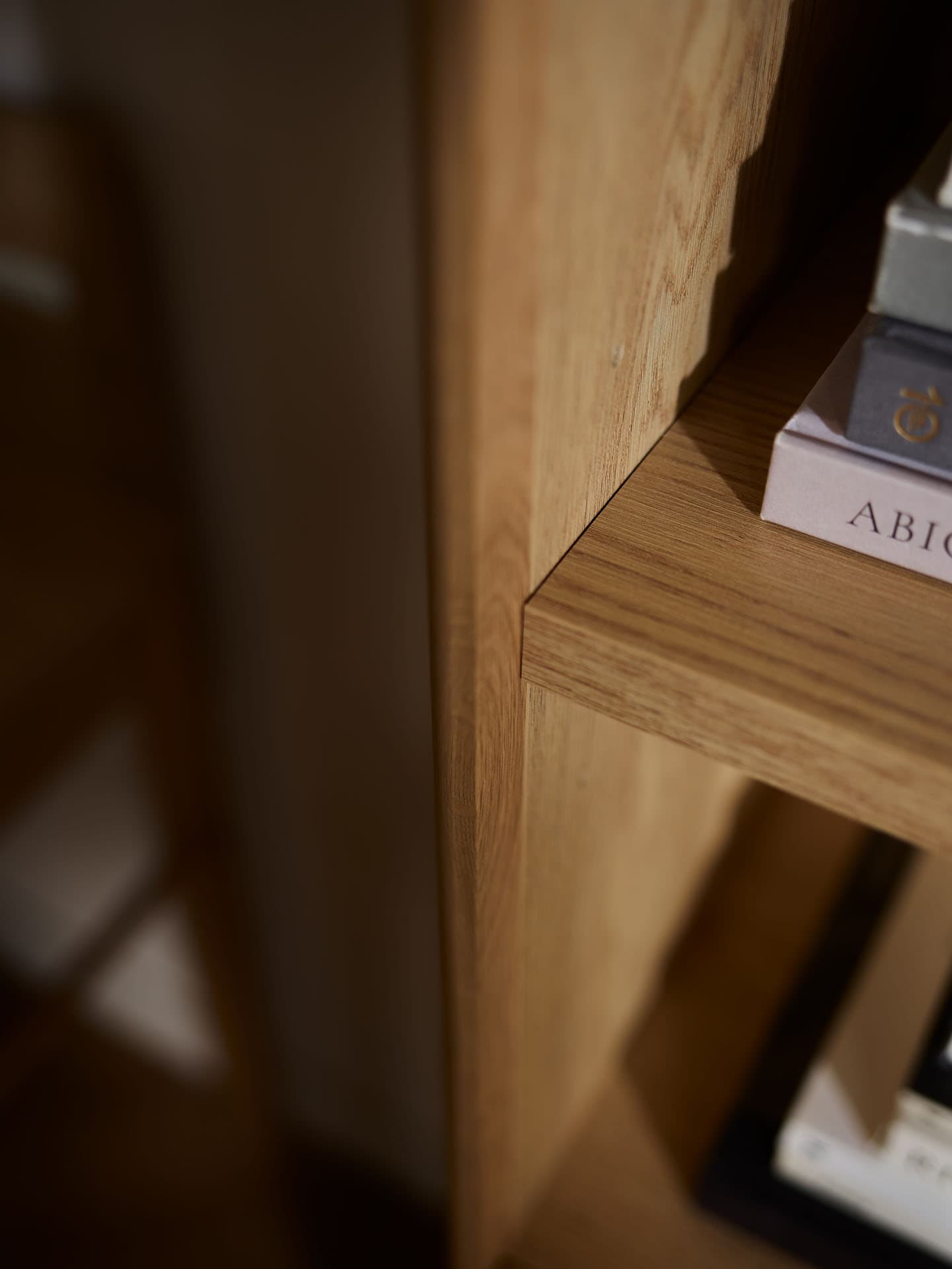 Regał szeroki Well łączy przechowywanie i ekspozycję w spokojnej, uporządkowanej formie. Charakter regału budują dębowe detale, które są widoczne i wyczuwalne w codziennym użytkowaniu. Subtelne obłości łagodzą formę bryły i sprawiają, że regał dobrze wpisuje się zarówno w strefę dzienną, jak i domowy gabinet czy sypialnię.