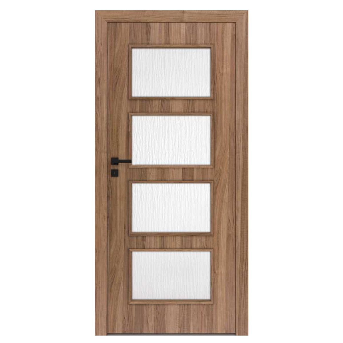 Skrzydło drzwiowe Modern wykonane jest z ramiaka iglastego, wypełnienie stanowi wkład stabilizujący "plaster miodu". Płyta HDF jest uszlachetnioną okleiną dekoracyjną DRE-Cell Decor. Zastosowane w nim komponenty sprawiają, że powierzchnia DRE-Cell Decor jest elastyczna, co zapobiega m. in. pękaniu nawet przy uderzeniu ciężkimi przedmiotami i przy zwykłym użytkowaniu, oraz odporna jest na zarysowania. Wyposażenie standardowe to: dwa lub trzy zawiasy srebrne, zamek na klucz, blokada łazienkowa, wkładka patentowa, lub zamek oszczędnościowy, szyba "kora biała" o grubości 4 mm. Opcjonalnie można wybrać szyby Chinchila lub Żaluzja. Skrzydło przygotowane jest do ewentualnego przycięcia (max. 60 mm) a także wykonania go w systemie przesuwnym.