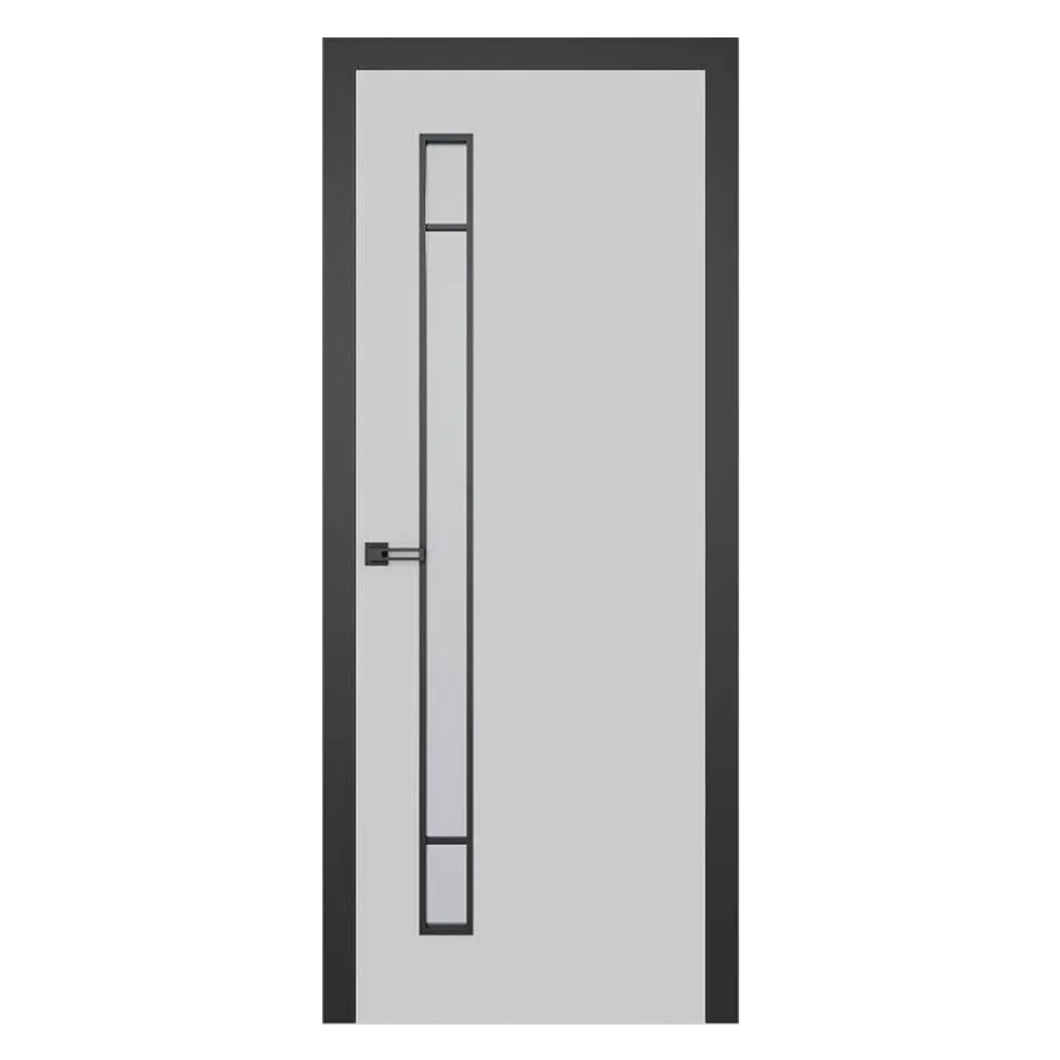 Drzwi płytowe o wysokości skrzydła 2300 (za dopłatą) i 2043 mm z czarną ramką SLIM i szprosami. Wypełnienie skrzydła stanowi płyta wiórowa pełna, szyba bezpieczna klejona VSG 22.1 mleczna lub przeźroczysta. Powierzchnia