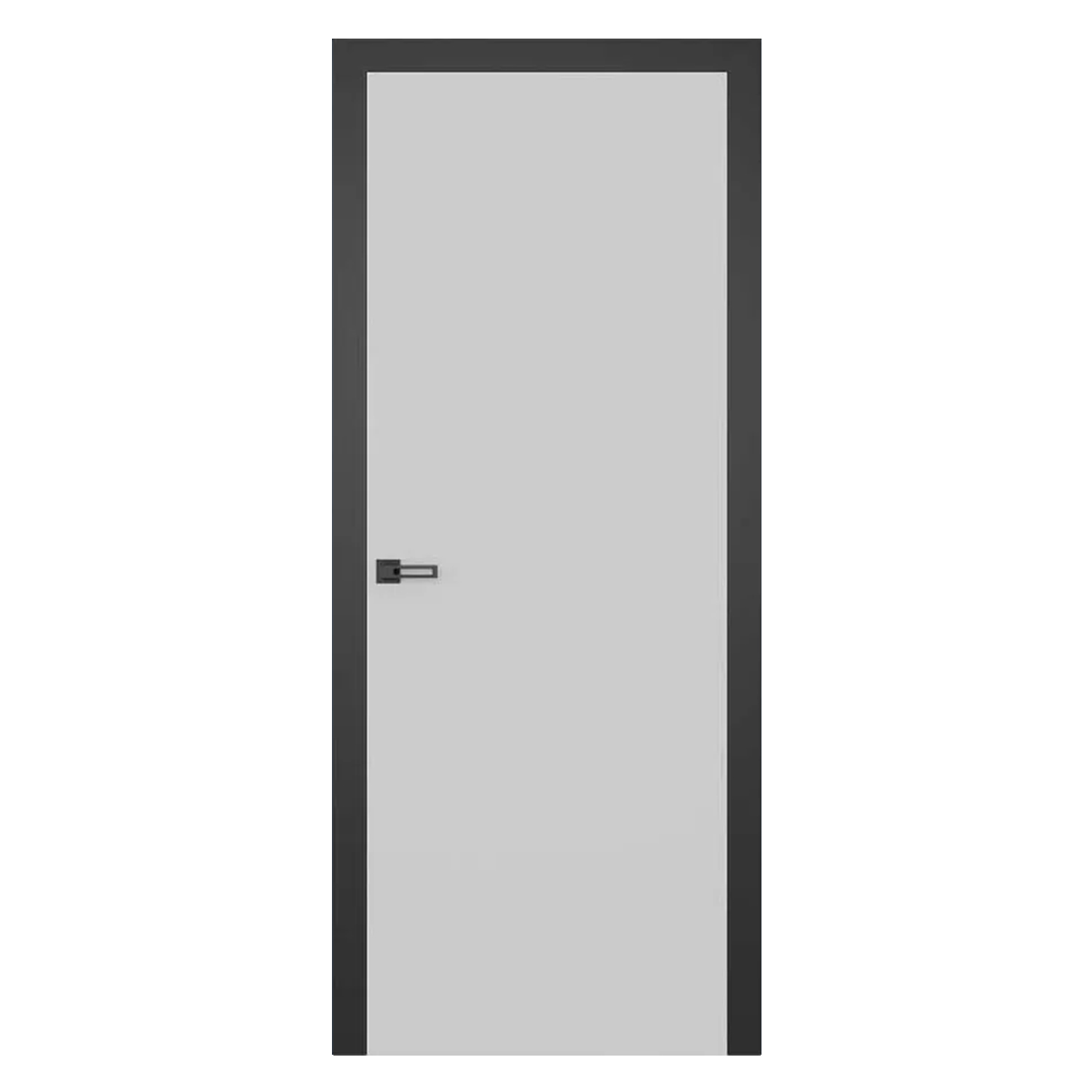 Drzwi płytowe o wysokości skrzydła 2300 (za dopłatą) i 2043 mm z czarną ramką SLIM i szprosami. Wypełnienie skrzydła stanowi płyta wiórowa pełna, szyba bezpieczna klejona VSG 22.1 mleczna lub przeźroczysta. Powierzchnia