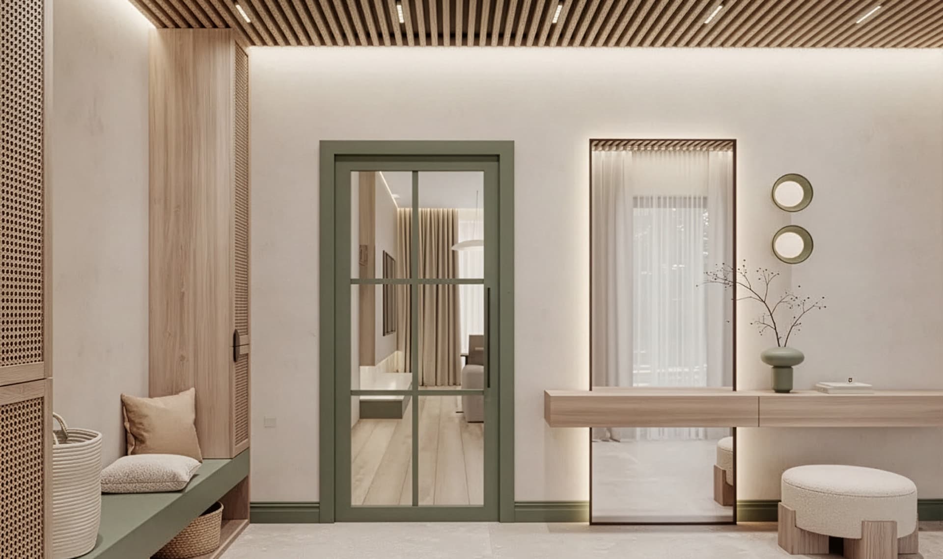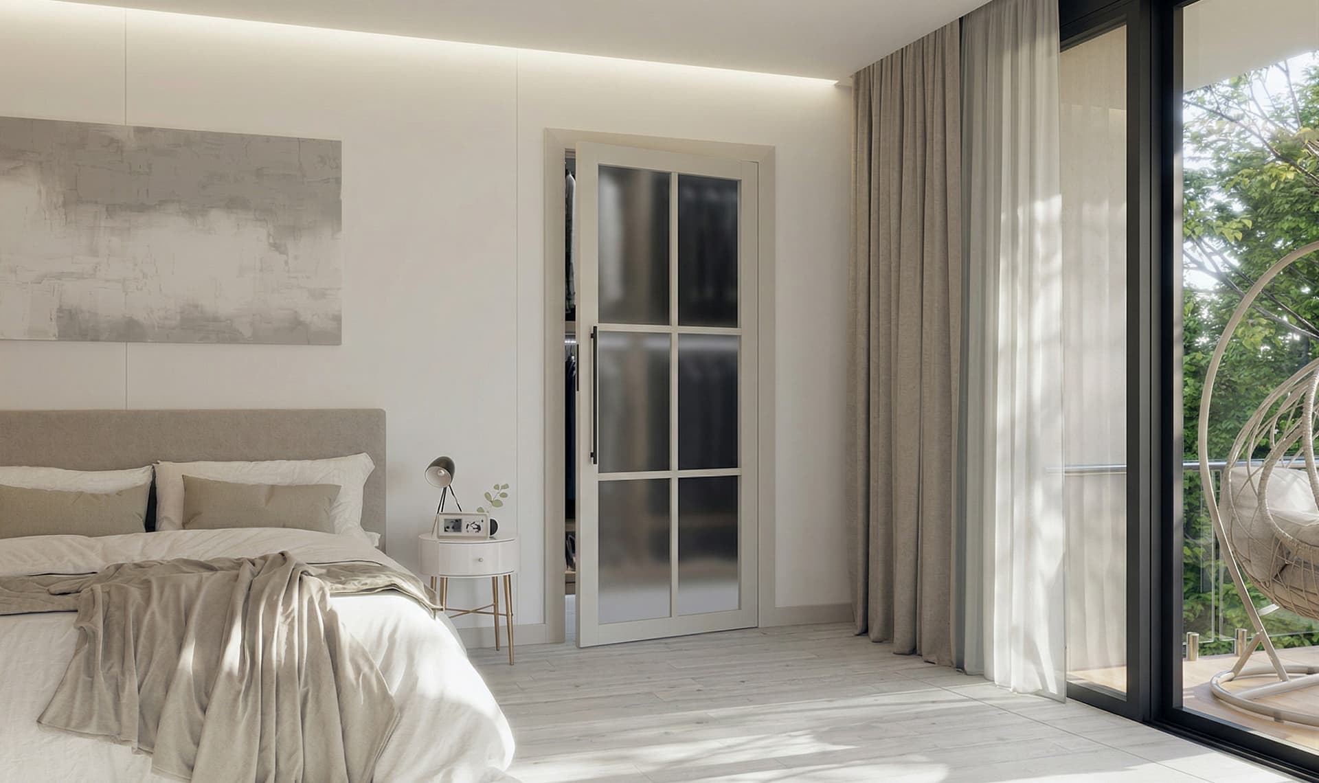 - Solidna Rama: Konstrukcja z MDF o szerokości 80 mm zapewnia stabilność przy zachowaniu wizualnej lekkości całych drzwi.