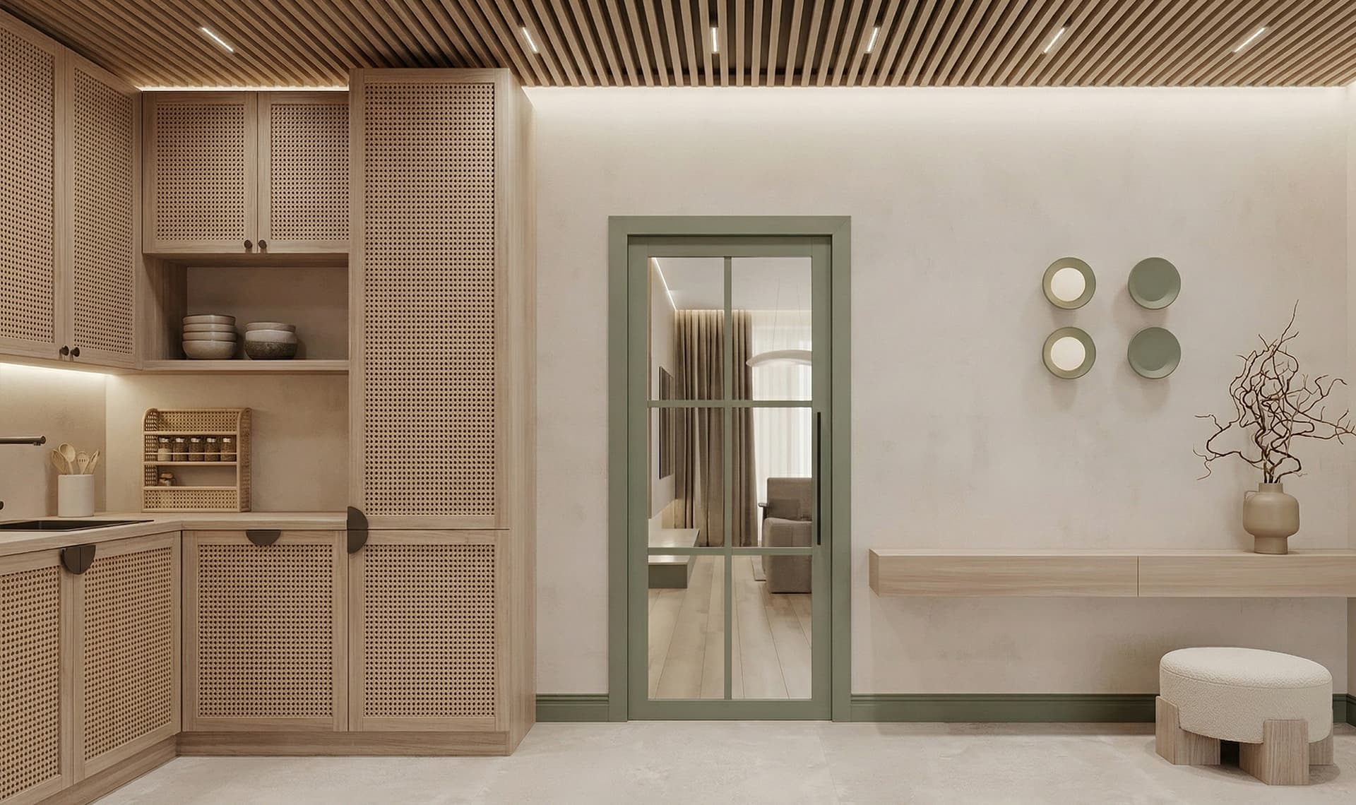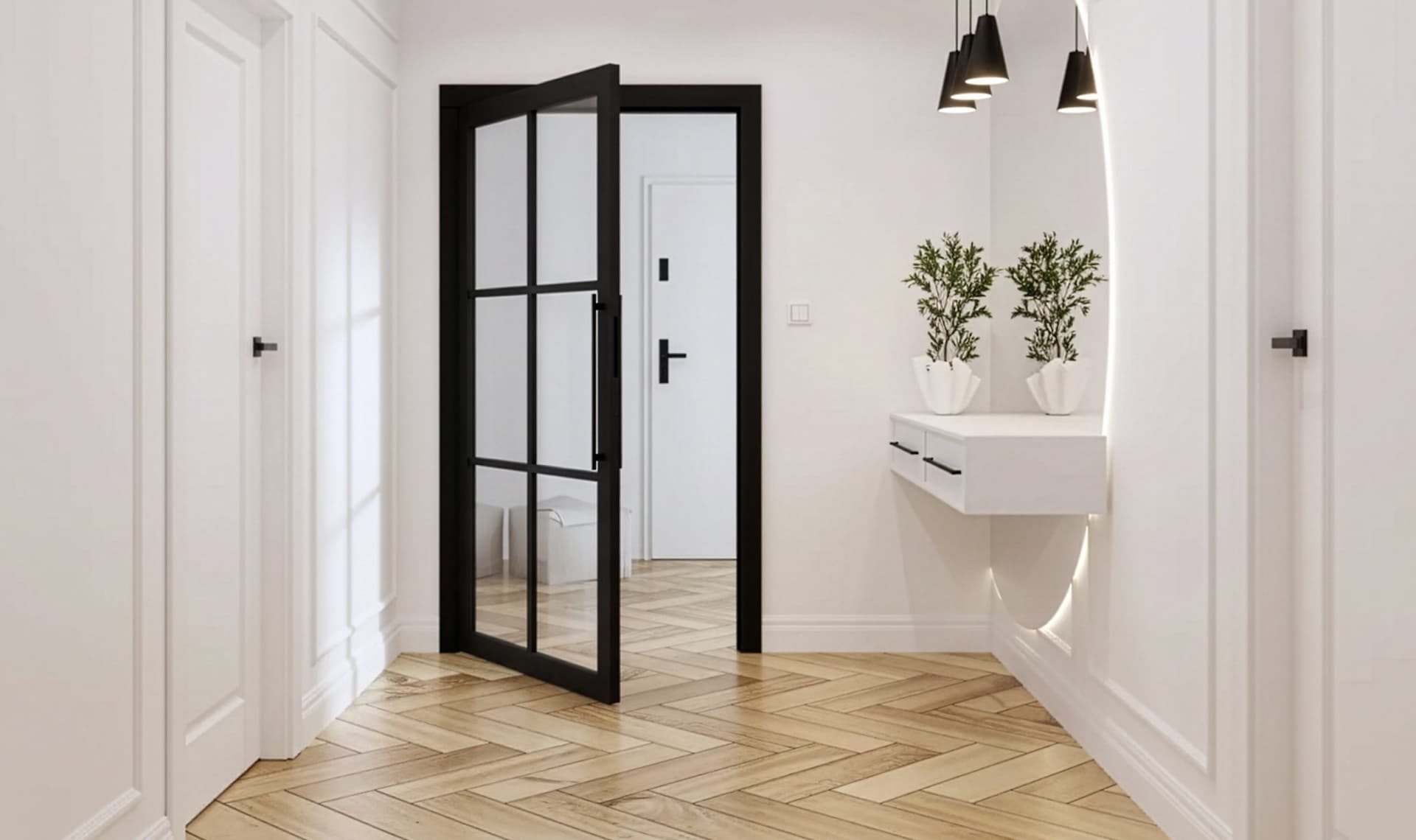 - Designerskie Uchwyty: Zamiast tradycyjnej klamki, drzwi przygotowano pod montaż nowoczesnych pochwytów (Factor lub Nomi), co nadaje im unikalny, loftowy charakter.
