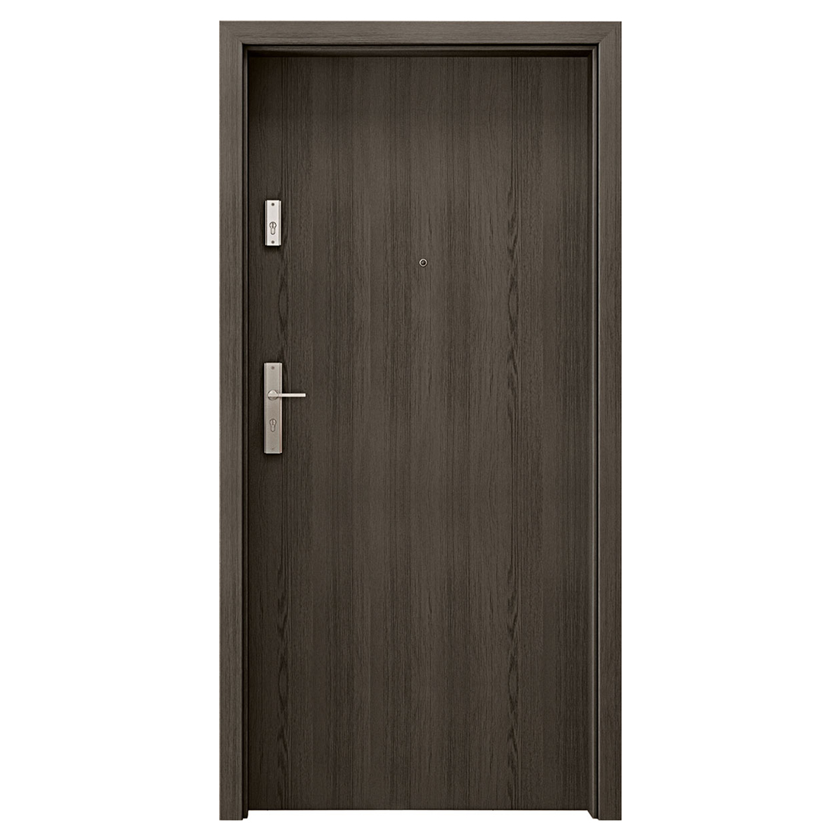 Skrzydło drzwiowe wykonane jest na bazie czopowanej ramy z klejonki drewna iglastego wypełnionej płytą wiórową. Wyposażone jest w wielopunktowy zamek listwowy, 3 zawiasy wzmocnione.