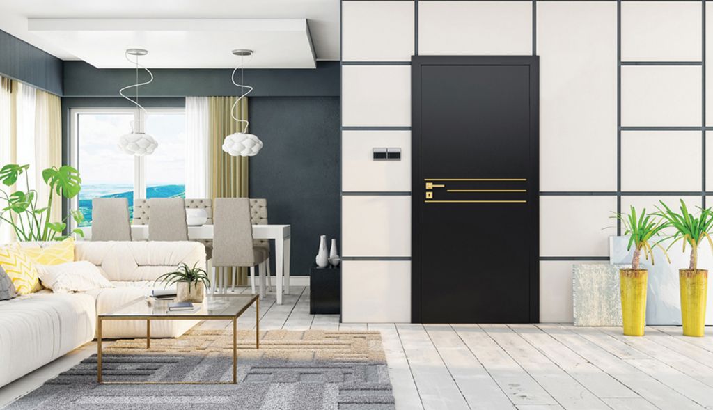 ramiak obłożony jest dwiema malowanymi płytami HDF z wstawkami z dekoracyjnych listew aluminiowych. Wypełnienie stanowi płyta wiórowa pełna. Skrzydło wyposażone jest w zamek jednopunktowy, wpuszczany o