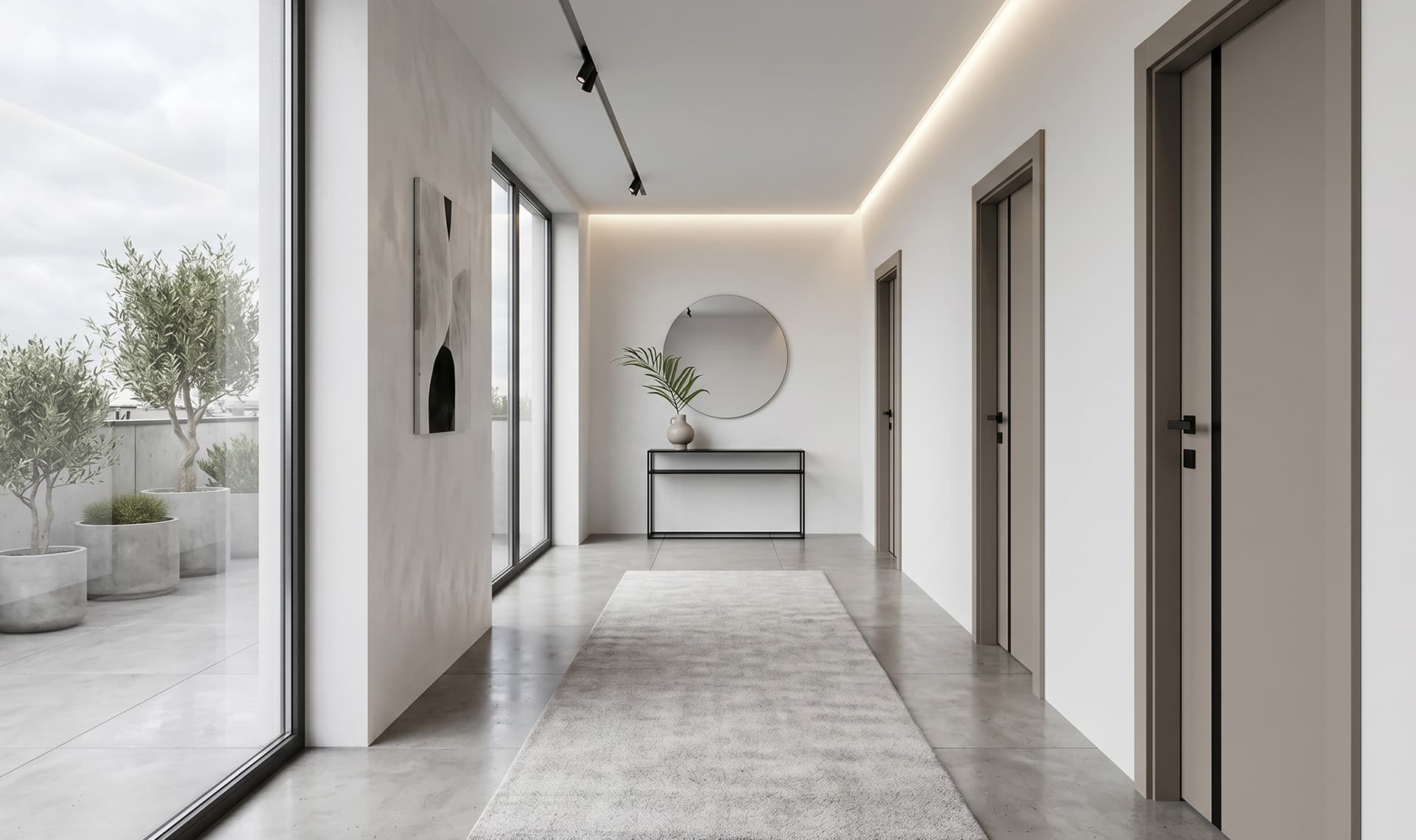 - Optyczne Powiększenie: Pionowe, wąskie przeszklenie sprawia, że nawet małe i ciemne przedpokoje stają się jaśniejsze i wydają się wyższe.