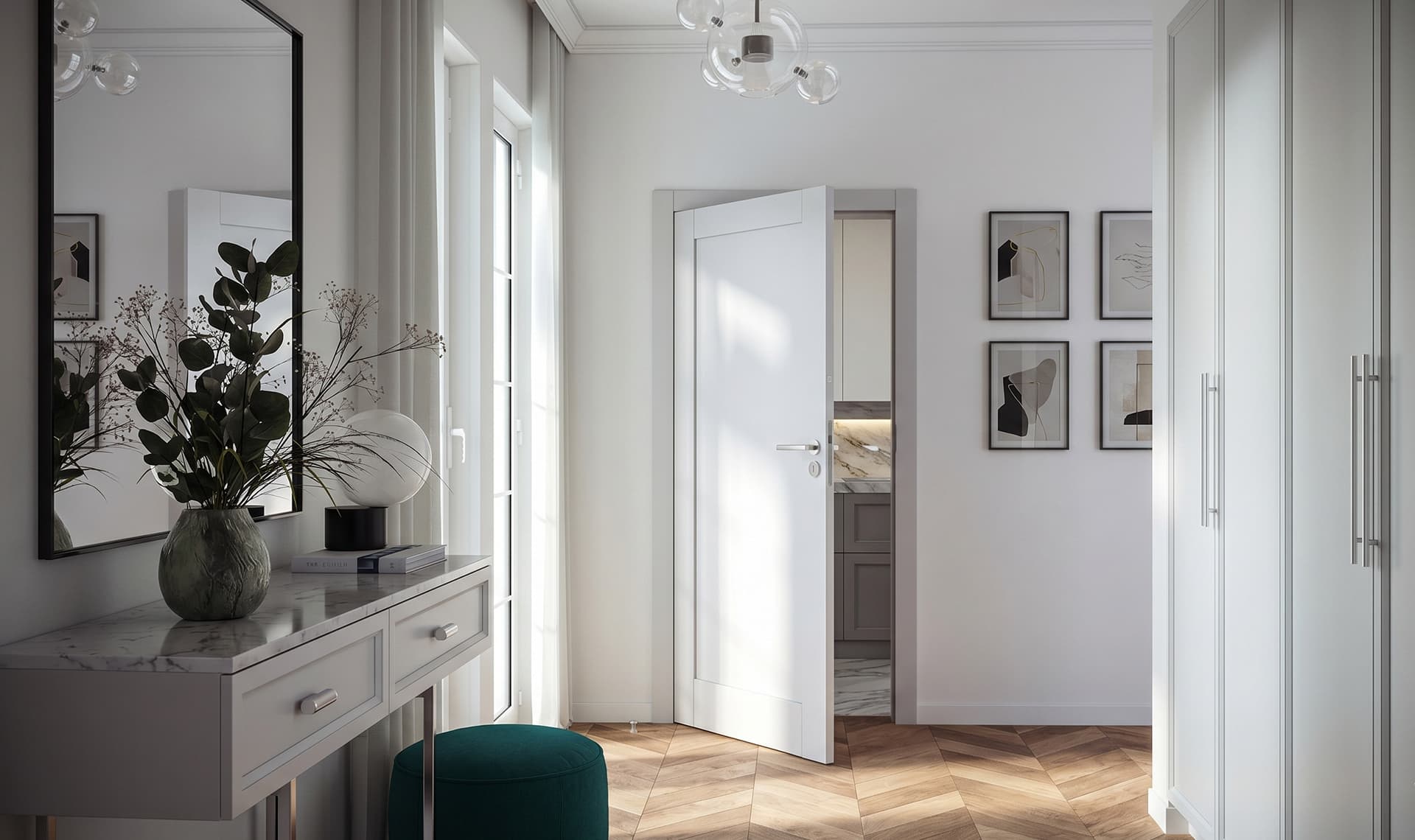 Drzwi dla najbardziej wymagających. Połączenie rzemieślniczej solidności drewna z technologią lakieru, który pozostaje biały przez dziesięciolecia.