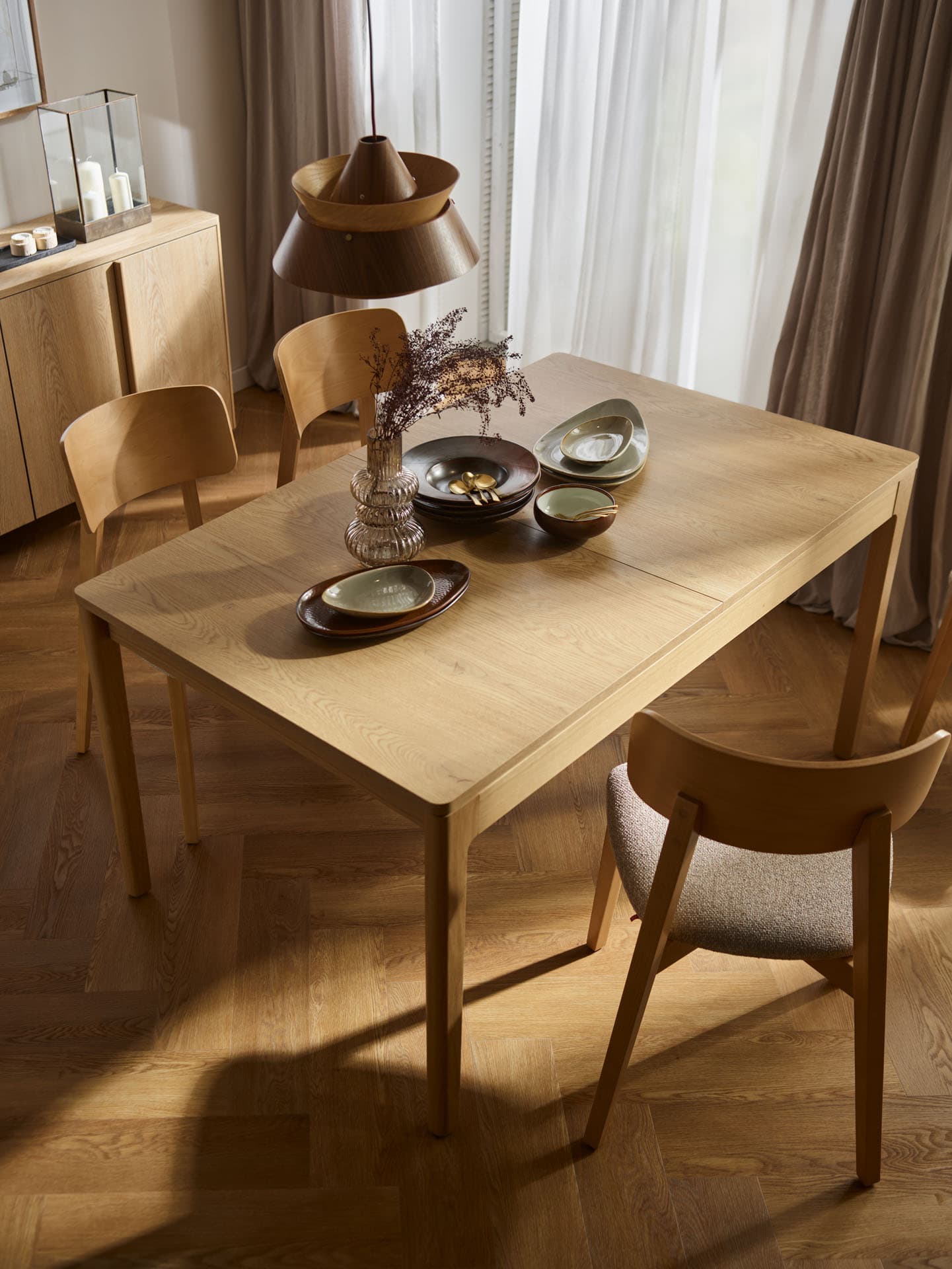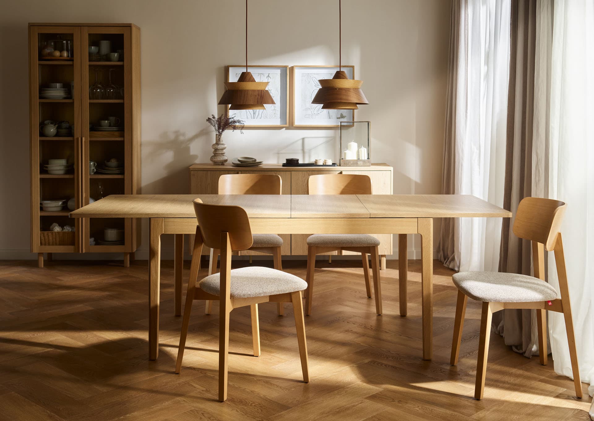 - Dzięki solidnej konstrukcji i stabilnej oskrzyni dębowej stół zachowuje pewność i równowagę w każdej konfiguracji, sprzyjając swobodnemu użytkowaniu zarówno podczas codziennych posiłków, jak i dłuższych spotkań przy stole.