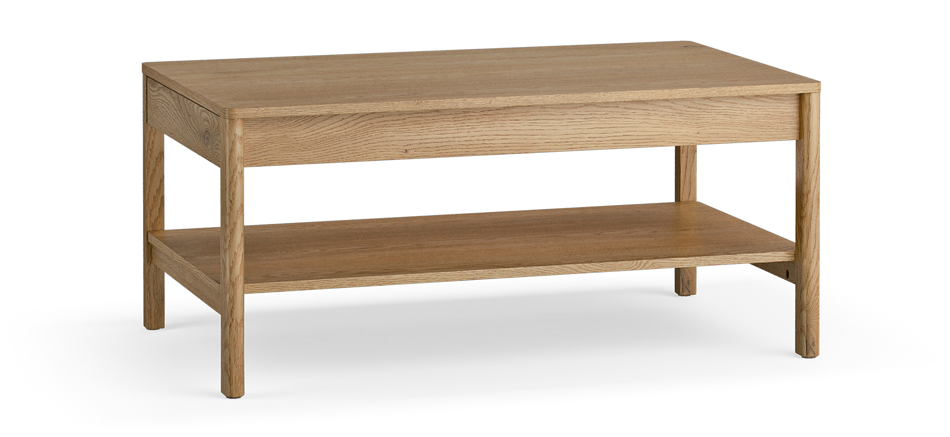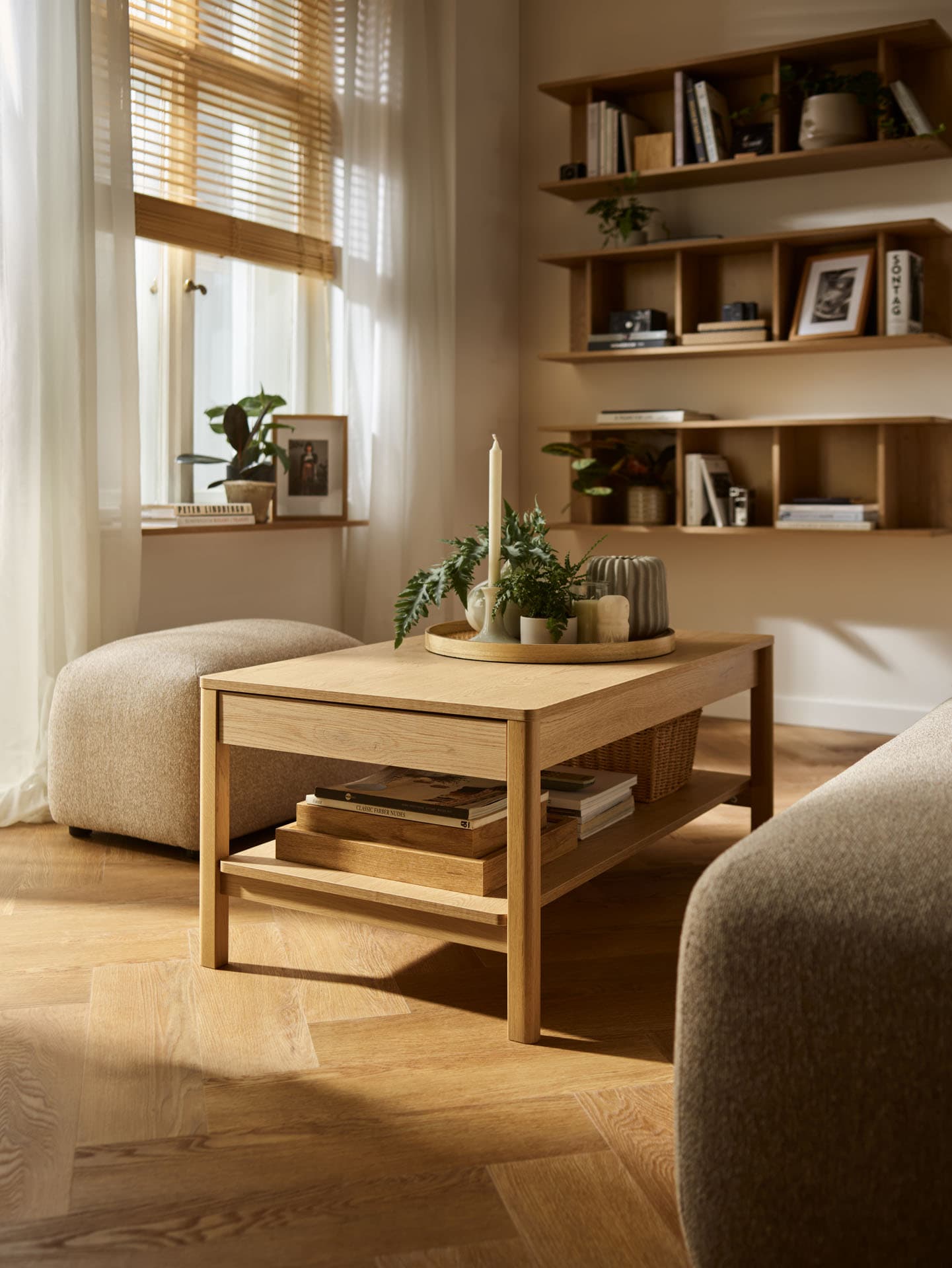 Prostokątny stolik kawowy z kolekcji Well porządkuje strefę wypoczynkową i zapewnia wygodne miejsce na drobne akcesoria. Przemyślana konstrukcja łączy funkcję przestronnego blatu, dyskretnej, zamkniętej szuflady oraz pojemnej dolnej półki, umożliwiając utrzymanie porządku i estetyki wnętrza.