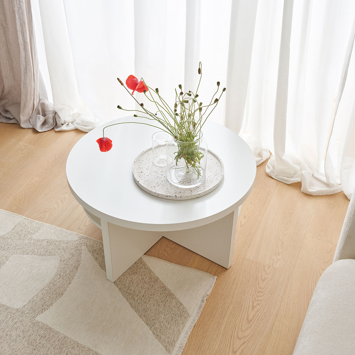 - Stolik Talvo o średnicy 70 cm ma biały kolor.