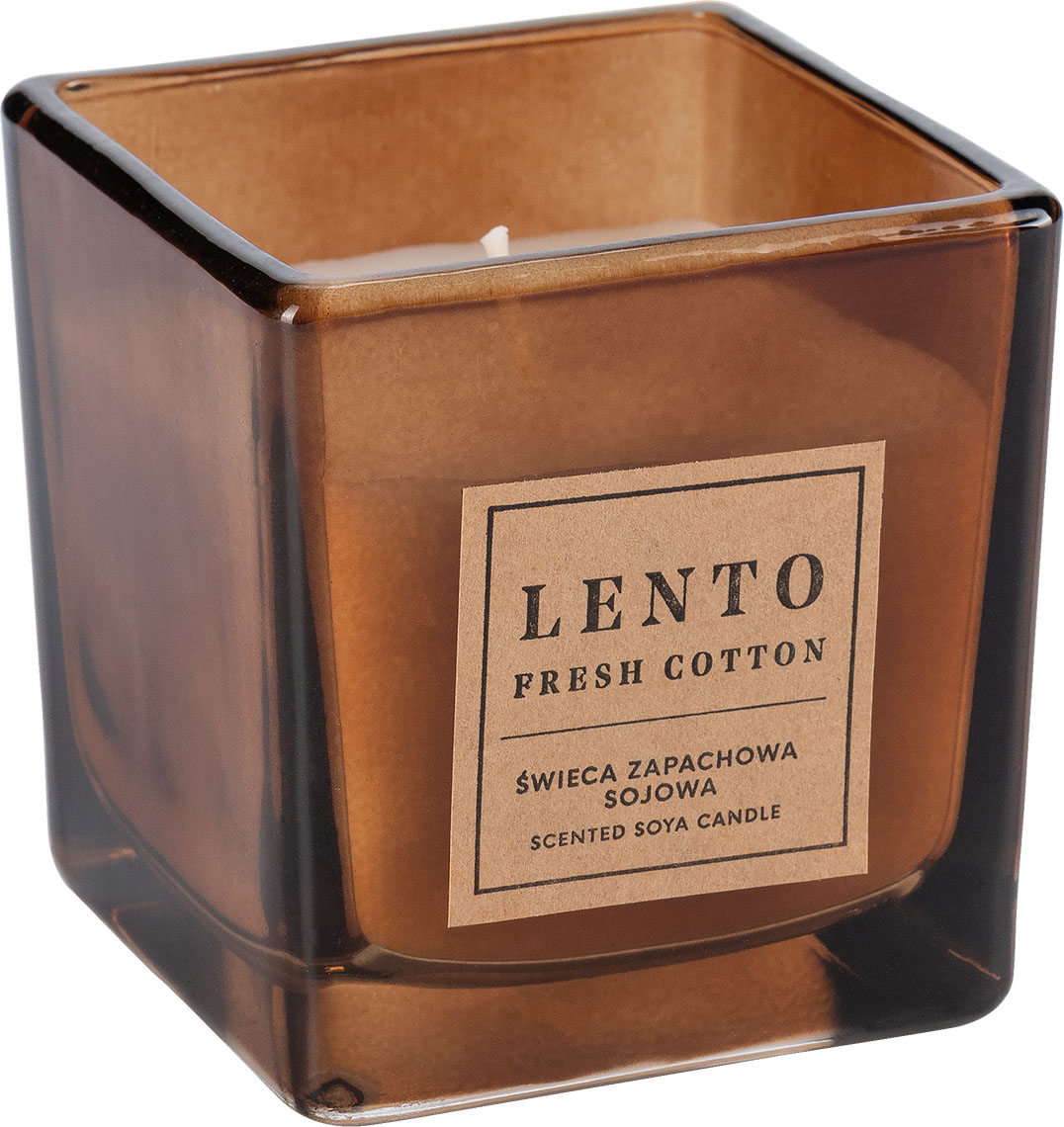 Dzięki świecy Lento wnętrze nabierze przytulnej atmosfery sprzyjającej wyciszeniu i afirmacji spokoju. Delikatny zapach świeżej bawełny zapewni komfort i atmosferę domowego ogniska. Duży udział sojowego wosku sprawia, że podczas wypalania produkt nie emituje toksycznych substancji. Kwadratowy słoik możesz wyczyścić i ponownie użyć – sprawdzi się jako lampion na tealighty lub organizer na drobiazgi.