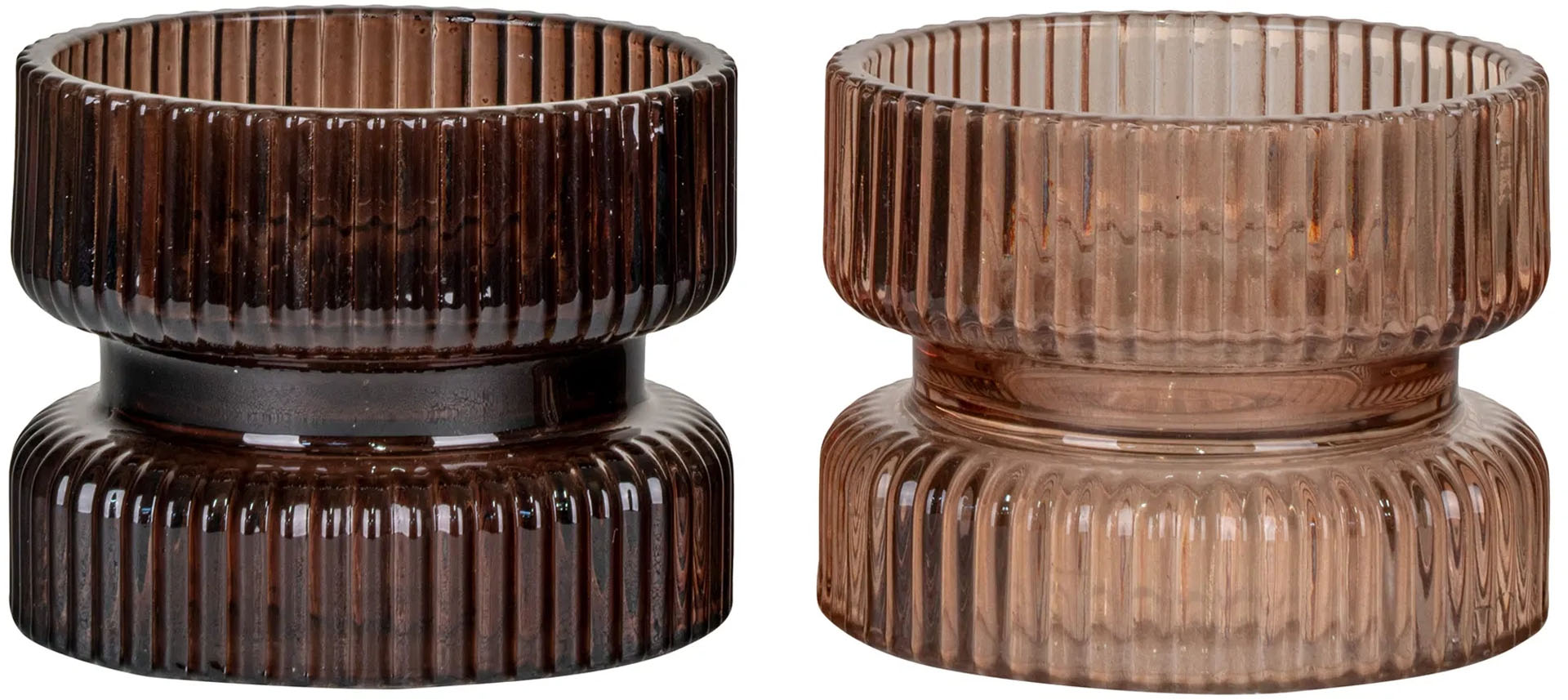 Wprowadź do wnętrza ciepło i subtelny blask z kompletem dwóch szklanych świeczników o eleganckiej, żebrowanej strukturze. Harmonijny duet w różnych odcieniach brązu tworzy wyjątkową dekorację – zarówno z zapaloną świecą, jak i solo. Idealne do nowoczesnych i klimatycznych przestrzeni, gdzie liczy się detal, nastrój i szlachetna prostota.
