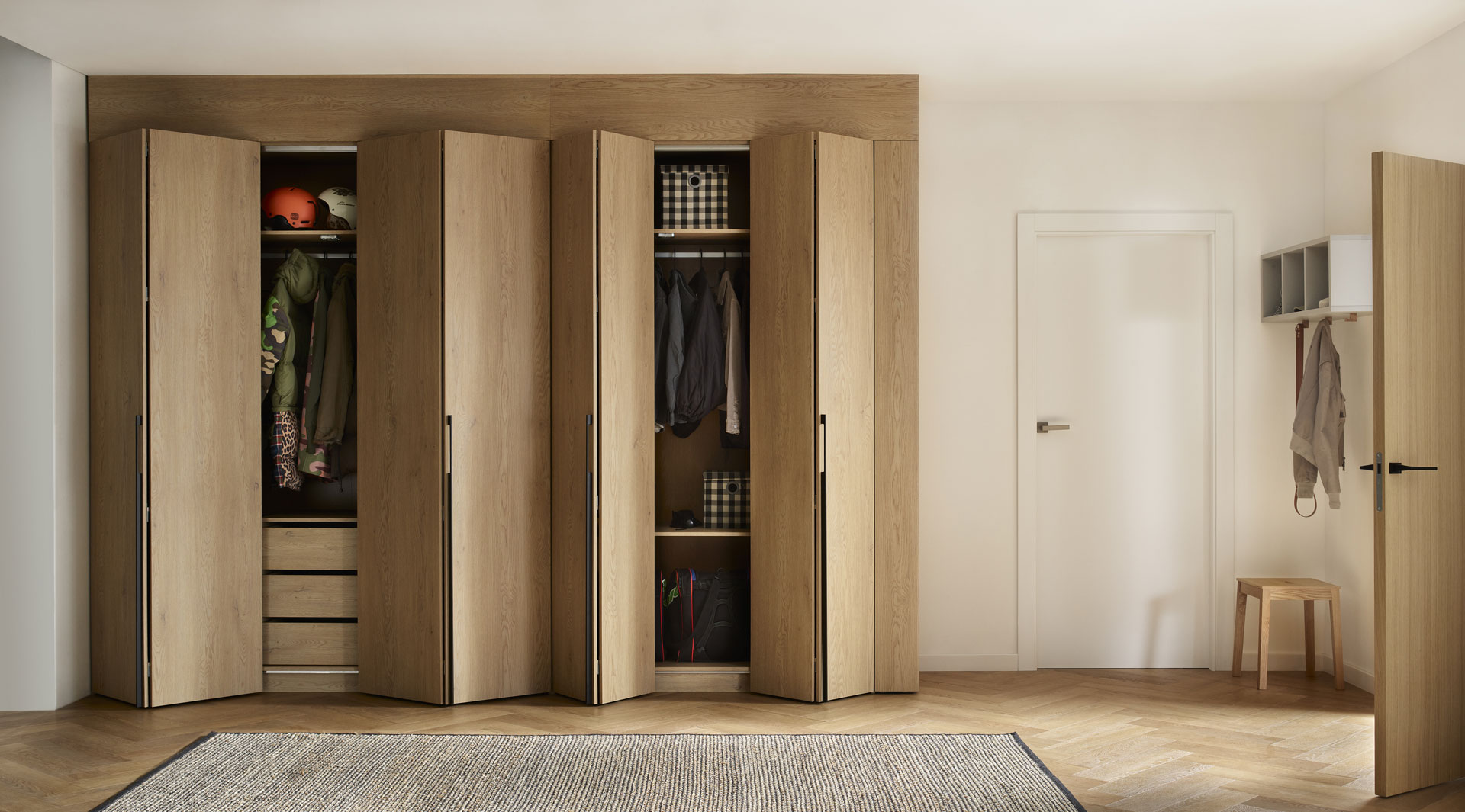 - Przesuwno-składane drzwi zapewniają swobodny dostęp do jej całej zawartości. Oszczędzają też miejsce w pokoju. Dzięki elegancko ukrytym zawiasom lekko się rozsuwają i cicho domykają.