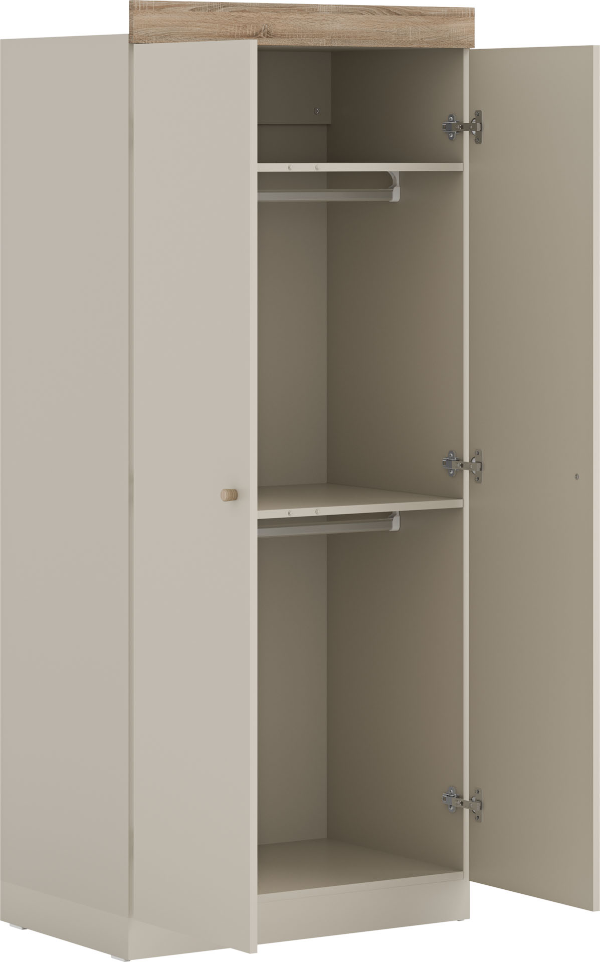 Szafa 2-drzwiowa Sande pozwala uporządkować dziecięce ubranka i rośnie razem z dzieckiem. Ma dwie półki i dwa drążki na wieszaki. Prosty i elegancki mebel z dębowymi akcentami pasuje do różnych aranżacji wnętrz.