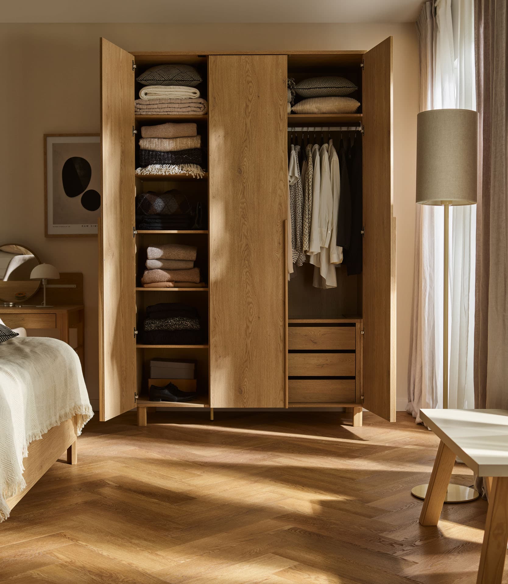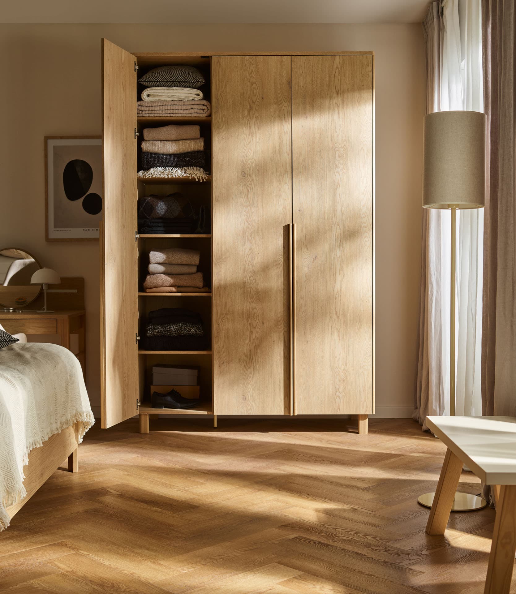 - Meble z kolekcji Well są w identycznym kolorze co dębowe szafy Stor. To idealne rozwiązanie, jeśli chcesz uzupełnić swoją aranżację o elementy z innej serii, zachowując identyczny odcień i strukturę materiału.