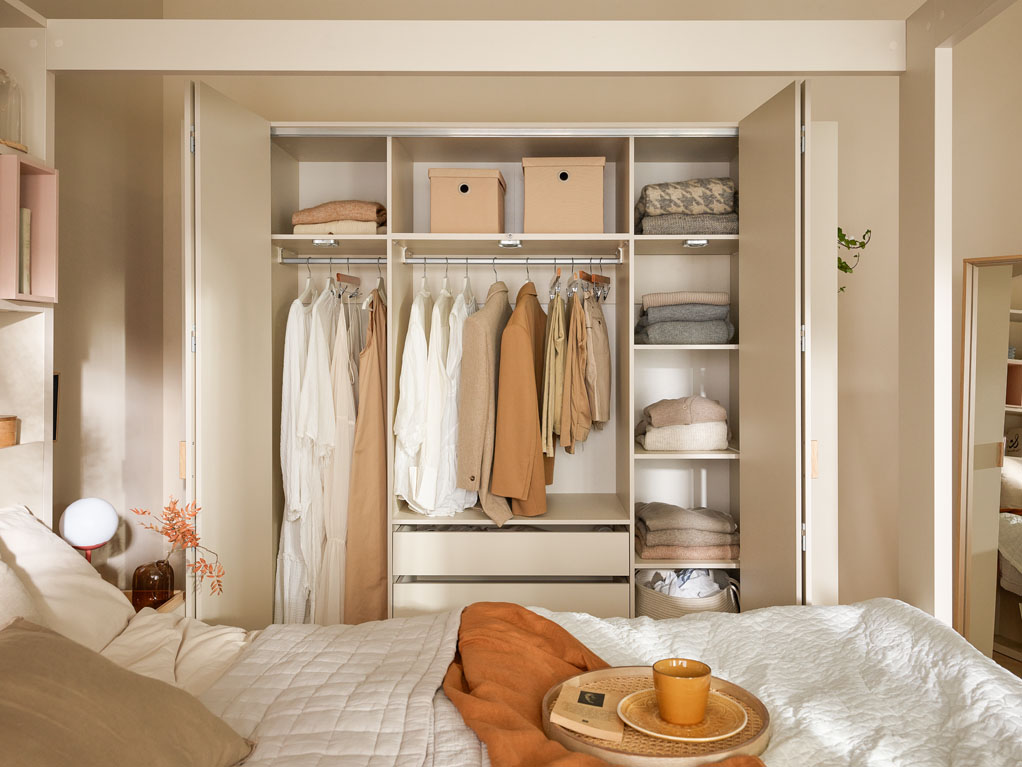 - Wewnątrz szafy znajdują się lampki LED z czujnikami ruchu – zapalają się podczas otwierania mebla. Dzięki temu można wyjmować ubrania bez konieczności oświetlania całej sypialni.